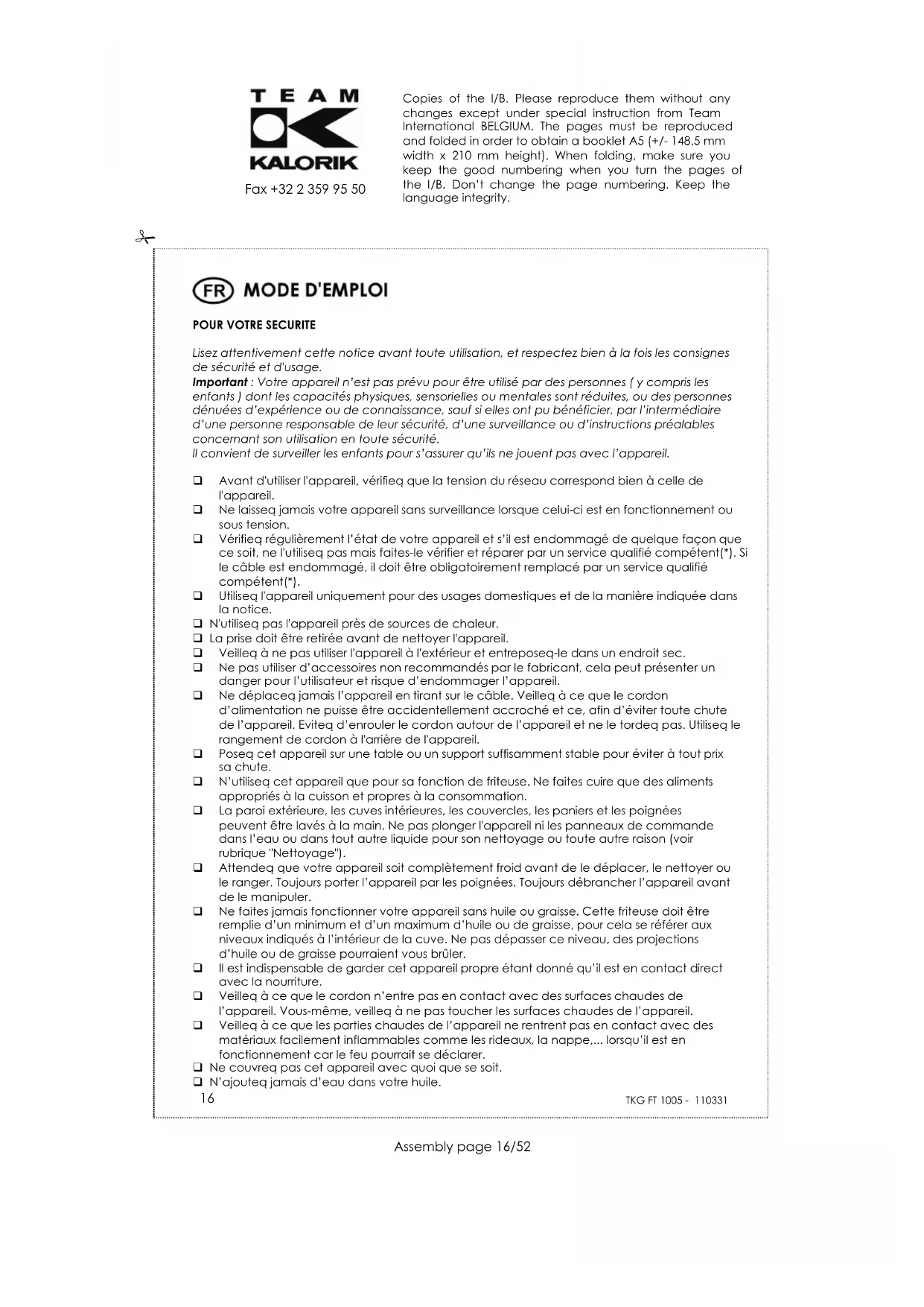 Fax +32 2 359 95 50 Assurez-vous que les aliments sont le plus secs possible. Il est interdit de mettre en place le couvercle sur la friteuse lors de son utilisation, cela pourrait causer un risque d’incendie ou de débordement de la friteuse. Dans ce cas, le couvercle ne sert que pour le rangement et pour le transport (une fois la friteuse refroidie). ATTENTION: La friteuse peut atteindre une température élevée pendant son utilisation. Les préparations à l'huile ou à la graisse peuvent s'enflammer si elles sont surchauffées. Veillez donc à ne jamais laisser votre friteuse allumée pour de longues périodes. Avant de débrancher l’appareil, positionnez le réglage thermostatique sur sa température la plus faible (“Min”). Veillez à ventiler la pièce durant le fonctionnement. Attention si vous utilisez les deux friteuses en même temps, la consommation sera d'environ 19,5 ampères. Par conséquent il est fortement conseillé de brancher chaque friteuse sur un circuit différent. Avant de brancher la friteuse, assurez-vous que le circuit sur lequel vous allez la brancher peut supporter la consommation indiquée. Ne branchez aucune des friteuses sur une prise multiple. Votre appareil ne doit jamais être mis en fonctionnement par le biais d’une minuterie extérieure ou d’un autre système de commande à distance séparé.