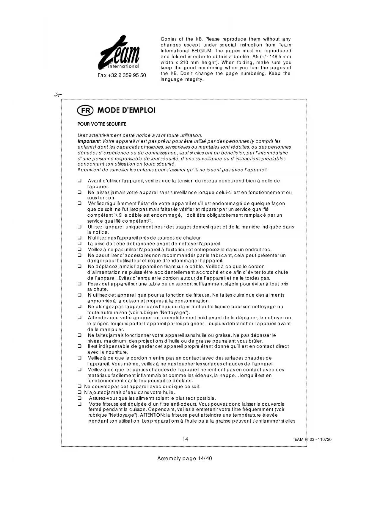 Assembly page 14/40 Copies of the I/B. Please reproduce them without any changes except under special instruction from Team International BELGIUM. The pages must be reproduced and folded in order to obtain a booklet A5 (+/- 148.5 mm width x 210 mm height). When folding, make sure you keep the good numbering when you turn the pages of the I/B. Don’t change the page numbering. Keep the language integrity. Fax +32 2 359 95 50 sont surchauffées. Soyez donc extrêmement prudent de ne pas laisser votre friteuse allumée pour de longues périodes. Avant de débrancher l’appareil, positionnez la minuterie sur "OFF" et le thermostat sur "MIN". Veillez à ventiler la pièce durant le fonctionnement. Si vous utilisez de la graisse solide, coupez-la en petits morceaux et placez ceux-ci dans la cuve. Mettez l’appareil en marche en réglant le thermostat sur sa position minimale et sélectionnez le temps voulu sur la minuterie. Chaque fois que l’indicateur lumineux s’éteint, positionnez le bouton de température sur une température plus élevée jusqu’à ce que la graisse ait fondu. Si le décompte de la minuterie se termine, sélectionnez une nouvelle durée. Une fois que la graisse a fondu, positionnez le thermostat sur la température désirée. Ce genre de graisse se solidifiera quand l’appareil refroidira. Votre appareil ne doit jamais être mis en fonctionnement par le biais d’une minuterie extérieure ou d’un autre système de commande à distance séparé.
