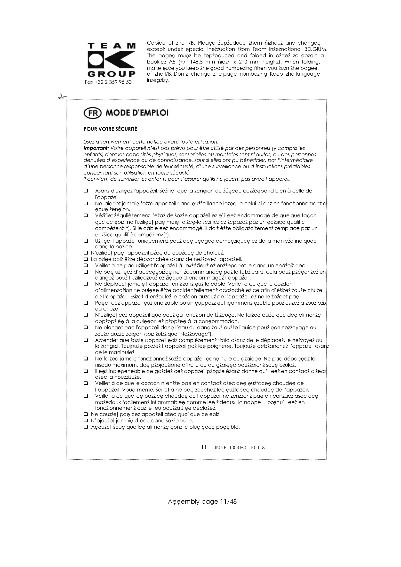 Lisez attentivement cette notice avant toute utilisation. Important: Votre appareil n’est pas prévu pour être utilisé par des personnes (y compris les enfants) dont les capacités physiques, sensorielles ou mentales sont réduites, ou des personnes dénuées d’expérience ou de connaissance, sauf si elles ont pu bénéficier, par l’intermédiaire d’une personne responsable de leur sécurité, d’une surveillance ou d’instructions préalables concernant son utilisation en toute sécurité. Il convient de surveiller les enfants pour s’assurer qu’ils ne jouent pas avec l’appareil. Avant d'utiliser l'appareil, vérifiez que la tension du réseau correspond bien à celle de l'appareil. Ne laissez jamais votre appareil sans surveillance lorsque celui-ci est en fonctionnement ou sous tension. Vérifiez régulièrement l’état de votre appareil et s’il est endommagé de quelque façon que ce soit, ne l'utilisez pas mais faites-le vérifier et réparer par un service qualifié compétent(*). Si le câble est endommagé, il doit être obligatoirement remplacé par un service qualifié compétent(*). Utilisez l'appareil uniquement pour des usages domestiques et de la manière indiquée dans la notice. N'utilisez pas l'appareil près de sources de chaleur. La prise doit être débranchée avant de nettoyer l'appareil. Veillez à ne pas utiliser l'appareil à l'extérieur et entreposez-le dans un endroit sec. Ne pas utiliser d’accessoires non recommandés par le fabricant, cela peut présenter un danger pour l’utilisateur et risque d’endommager l’appareil. Ne déplacez jamais l’appareil en tirant sur le câble. Veillez à ce que le cordon d’alimentation ne puisse être accidentellement accroché et ce afin d’éviter toute chute de l’appareil. Evitez d’enrouler le cordon autour de l’appareil et ne le tordez pas. Posez cet appareil sur une table ou un support suffisamment stable pour éviter à tout prix sa chute. N’utilisez cet appareil que pour sa fonction de friteuse. Ne faites cuire que des aliments appropriés à la cuisson et propres à la consommation. Ne plongez pas l'appareil dans l’eau ou dans tout autre liquide pour son nettoyage ou toute autre raison (voir rubrique "Nettoyage"). Attendez que votre appareil soit complètement froid avant de le déplacer, le nettoyer ou le ranger. Toujours porter l’appareil par les poignées. Toujours débrancher l’appareil avant de le manipuler. Ne faites jamais fonctionner votre appareil sans huile ou graisse. Ne pas dépasser le niveau maximum, des projections d’huile ou de graisse pourraient vous brûler. Il est indispensable de garder cet appareil propre étant donné qu’il est en contact direct avec la nourriture. Veillez à ce que le cordon n’entre pas en contact avec des surfaces chaudes de l’appareil. Vous-même, veillez à ne pas toucher les surfaces chaudes de l’appareil. Veillez à ce que les parties chaudes de l’appareil ne rentrent pas en contact avec des matériaux facilement inflammables comme les rideaux, la nappe... lorsqu’il est en fonctionnement car le feu pourrait se déclarer. Ne couvrez pas cet appareil avec quoi que ce soit. N’ajoutez jamais d’eau dans votre huile. Assurez-vous que les aliments sont le plus secs possible.Copies of the I/B. Please reproduce them without any changes except under special instruction from Team International BELGIUM. The pages must be reproduced and folded in order to obtain a booklet A5 (+/- 148.5 mm width x 210 mm height). When folding, make sure you keep the good numbering when you turn the pages of the I/B. Don’t change the page numbering. Keep the language integrity.