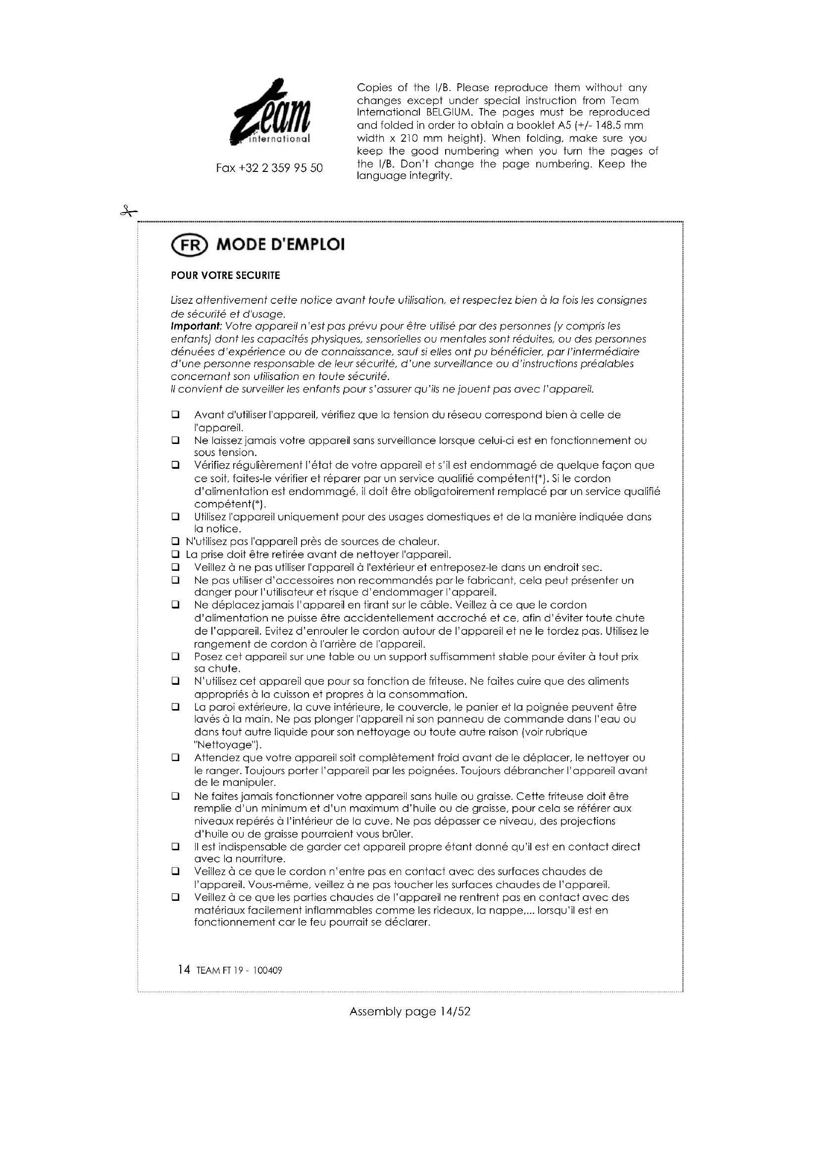 FT 19 - Friteuse TEAM - Notice d'utilisation et mode d'emploi gratuit