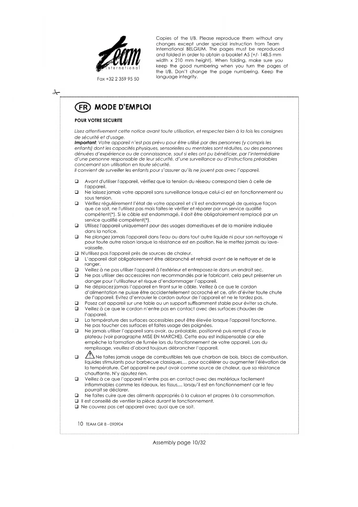 Afin de préserver notre environnement et notre santé, l‟élimination en fin de vie des appareils électriques et électroniques doit se faire selon des règles bien précises et nécessite l‟implication de chacun, qu‟il soit fournisseur ou utilisateur. C‟est pour cette raison que votre appareil, tel que le signale le symbole apposé sur sa plaque signalétique ou sur l'emballage, ne doit en aucun cas être jeté dans une poubelle publique ou privée destinée aux ordures ménagères. L'utilisateur a le droit de déposer l'appareil dans des lieux publics de collecte procédant à un tri sélectif des déchets pour être soit recyclé, soit réutilisé pour d‟autres applications conformément à la directive. Copies of the I/B. Please reproduce them without any changes except under special instruction from Team International BELGIUM. The pages must be reproduced and folded in order to obtain a booklet A5 (+/- 148.5 mm width x 210 mm height). When folding, make sure you keep the good numbering when you turn the pages of the I/B. Don‟t change the page numbering. Keep the language integrity.