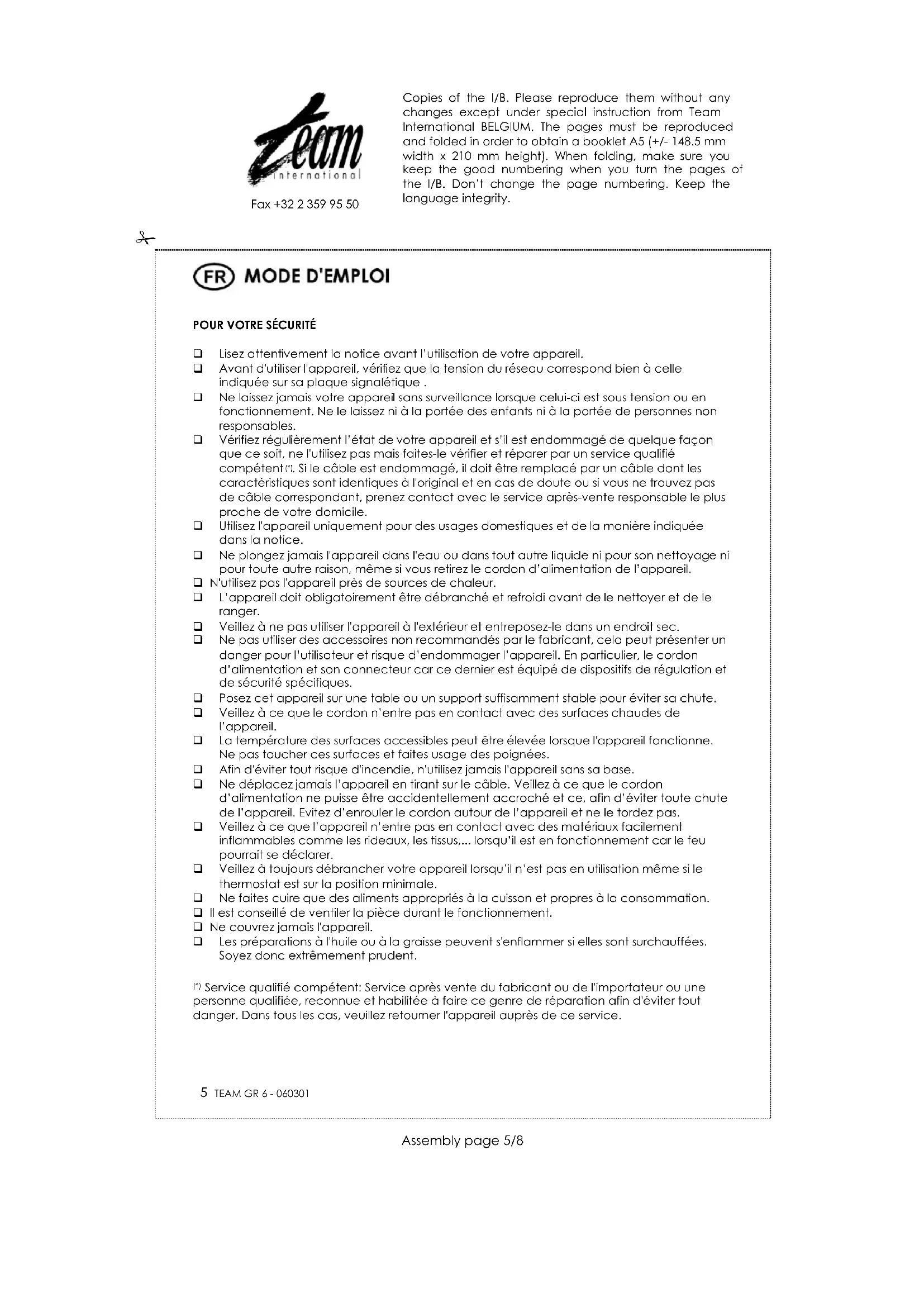Service qualifié compétent: Service après vente du fabricant ou de l'importateur ou une personne qualifiée, reconnue et habilitée à faire ce genre de réparation afin d'éviter tout danger. Dans tous les cas, veuillez retourner l'appareil auprès de ce service. Copies of the I/B. Please reproduce them without any changes except under special instruction from Team International BELGIUM. The pages must be reproduced and folded in order to obtain a booklet A5 (+/- 148.5 mm width x 210 mm height). When folding, make sure you keep the good numbering when you turn the pages of the I/B. Don’t change the page numbering. Keep the language integrity.