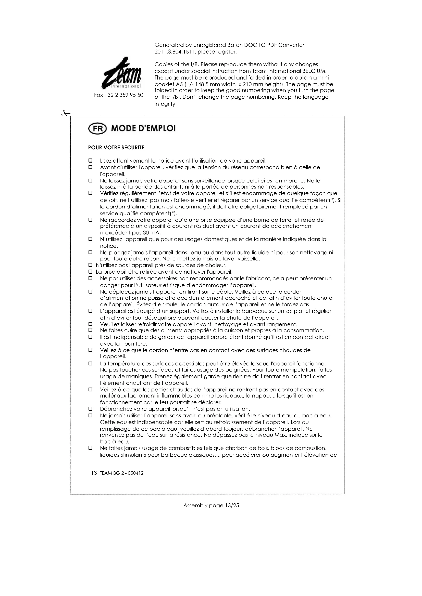 Lisez attentivement la notice avant l’utilisation de votre appareil. Avant d'utiliser l'appareil, vérifiez que la tension du réseau correspond bien à celle de l'appareil. Ne laissez jamais votre appareil sans surveillance lorsque celui-ci est en marche. Ne le laissez ni à la portée des enfants ni à la portée de personnes non responsables. Vérifiez régulièrement l’état de votre appareil et s’il est endommagé de quelque façon que ce soit, ne l’utilisez pas mais faites-le vérifier et réparer par un service qualifié compétent(*). Si le cordon d’alimentation est endommagé, il doit être obligatoirement remplacé par un service qualifié compétent(*). Ne raccordez votre appareil qu’à une prise équipée d’une borne de terre et reliée de préférence à un dispositif à courant résiduel ayant un courant de déclenchement n’excédant pas 30 mA. N’utilisez l'appareil que pour des usages domestiques et de la manière indiquée dans la notice. Ne plongez jamais l'appareil dans l'eau ou dans tout autre liquide ni pour son nettoyage ni pour toute autre raison. Ne le mettez jamais au lave -vaisselle. N'utilisez pas l'appareil près de sources de chaleur. La prise doit être retirée avant de nettoyer l'appareil. Ne pas utiliser des accessoires non recommandés par le fabricant, cela peut présenter un danger pour l’utilisateur et risque d’endommager l’appareil. Ne déplacez jamais l’appareil en tirant sur le câble. Veillez à ce que le cordon d’alimentation ne puisse être accidentellement accroché et ce, afin d’éviter toute chute de l’appareil. Évitez d’enrouler le cordon autour de l’appareil et ne le tordez pas. L’appareil est équipé d’un support. Veillez à installer le barbecue sur un sol plat et régulier afin d’éviter tout déséquilibre pouvant causer la chute de l’appareil. Veuillez laisser refroidir votre appareil avant nettoyage et avant rangement. Ne faites cuire que des aliments appropriés à la cuisson et propres à la consommation. Il est indispensable de garder cet appareil propre étant donné qu’il est en contact direct avec la nourriture. Veillez à ce que le cordon n’entre pas en contact avec des surfaces chaudes de l’appareil. La température des surfaces accessibles peut être élevée lorsque l'appareil fonctionne. Ne pas toucher ces surfaces et faites usage des poignées. Pour toute manipulation, faites usage de maniques. Prenez également garde que rien ne doit rentrer en contact avec l’élément chauffant de l’appareil. Veillez à ce que les parties chaudes de l’appareil ne rentrent pas en contact avec des matériaux facilement inflammables comme les rideaux, la nappe,... lorsqu’il est en fonctionnement car le feu pourrait se déclarer. Débranchez votre appareil lorsqu’il n’est pas en utilisation. Ne jamais utiliser l’appareil sans avoir, au préalable, vérifié le niveau d’eau du bac à eau. Cette eau est indispensable car elle sert au refroidissement de l’appareil. Lors du remplissage de ce bac à eau, veuillez d’abord toujours débrancher l’appareil. Ne renversez pas de l’eau sur la résistance. Ne dépassez pas le niveau Max. indiqué sur le bac à eau. Ne faites jamais usage de combustibles tels que charbon de bois, blocs de combustion, liquides stimulants pour barbecue classiques,... pour accélérer ou augmenter l’élévation deGenerated by Unregistered Batch DOC TO PDF Converter 2011.3.804.1511, please register! Copies of the I/B. Please reproduce them without any changes except under special instruction from Team International BELGIUM. The page must be reproduced and folded in order to obtain a mini booklet A5 (+/- 148.5 mm width x 210 mm height). The page must be folded in order to keep the good numbering when you turn the page of the I/B . Don’t change the page numbering. Keep the language integrity.