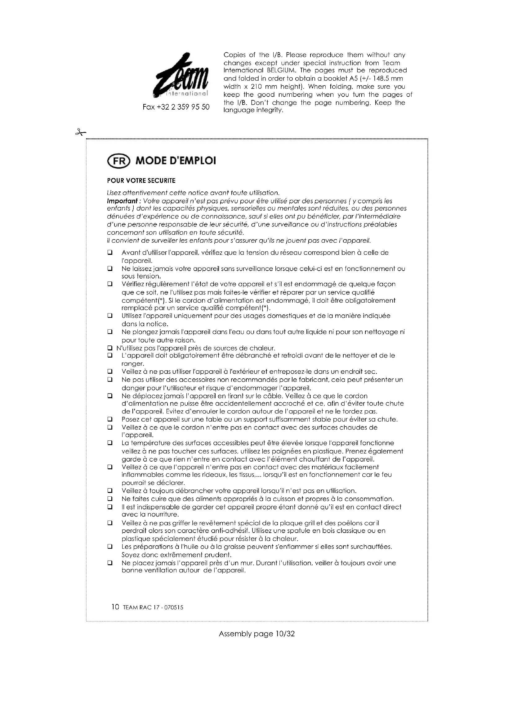 Afin de préserver notre environnement et notre santé, l’élimination en fin de vie des appareils électriques et électroniques doit se faire selon des règles bien précises et nécessite l’implication de chacun, qu’il soit fournisseur ou utilisateur. C’est pour cette raison que votre appareil, tel que le signale le symbole apposé sur sa plaque signalétique ou sur l'emballage, ne doit en aucun cas être jeté dans une poubelle publique ou privée destinée aux ordures ménagères. L'utilisateur a le droit de déposer l'appareil dans des lieux publics de collecte procédant à un tri sélectif des déchets pour être soit recyclé, soit réutilisé pour d’autres applications conformément à la directive. Copies of the I/B. Please reproduce them without any changes except under special instruction from Team International BELGIUM. The pages must be reproduced and folded in order to obtain a booklet A5 (+/- 148.5 mm width x 210 mm height). When folding, make sure you keep the good numbering when you turn the pages of the I/B. Don’t change the page numbering. Keep the language integrity.