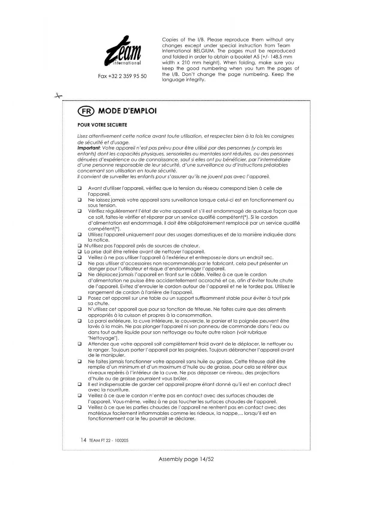 Séchez vos aliments avant de les mettre dans la friteuse. Des aliments trop humides peuvent faire bouillonner l‟huile et éventuellement la faire déborder. Veillez à ce que les aliments aient environ les mêmes dimensions pour permettre une cuisson homogène. Certains aliments peuvent être panés ou enrobés de pâte pour frire. Attendez que le préchauffage soit terminé et que le témoin s‟éteigne avant de mettre les aliments dans le panier. Ne remplissez pas trop le panier. Copies of the I/B. Please reproduce them without any changes except under special instruction from Team International BELGIUM. The pages must be reproduced and folded in order to obtain a booklet A5 (+/- 148.5 mm width x 210 mm height). When folding, make sure you keep the good numbering when you turn the pages of the I/B. Don‟t change the page numbering. Keep the language integrity.