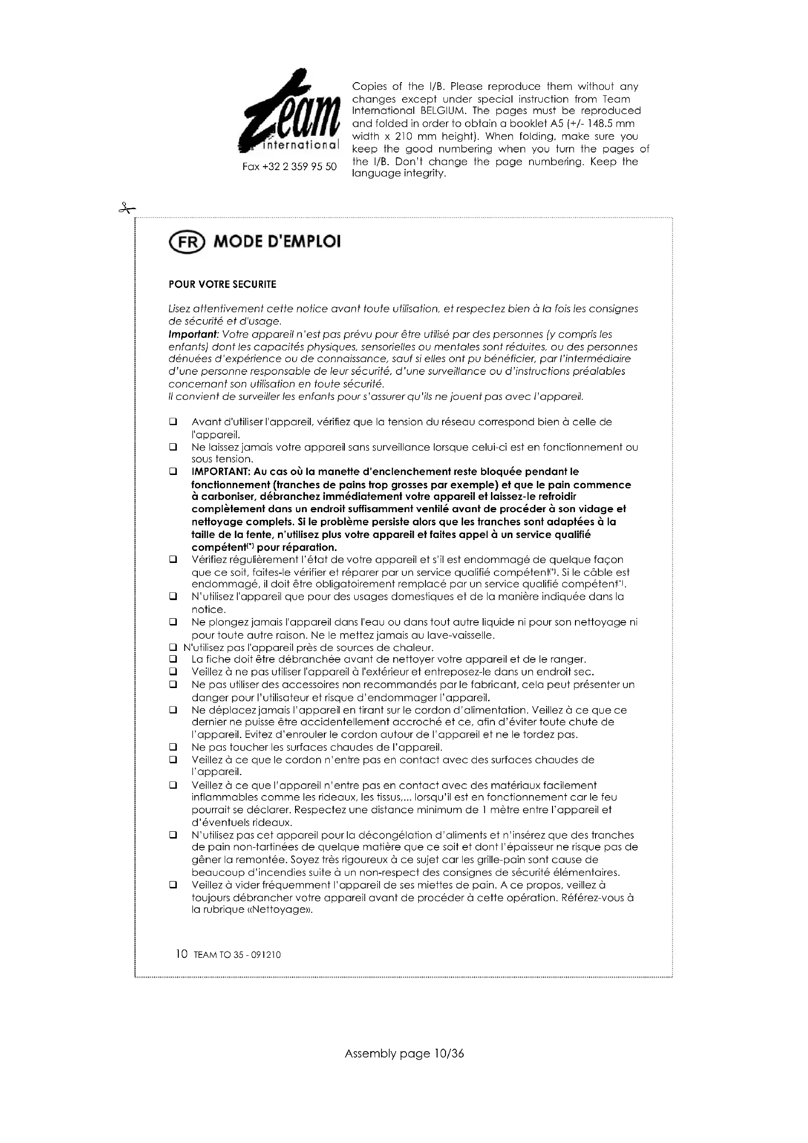 TO 35 - Grille pain TEAM - Notice d'utilisation et mode d'emploi gratuit