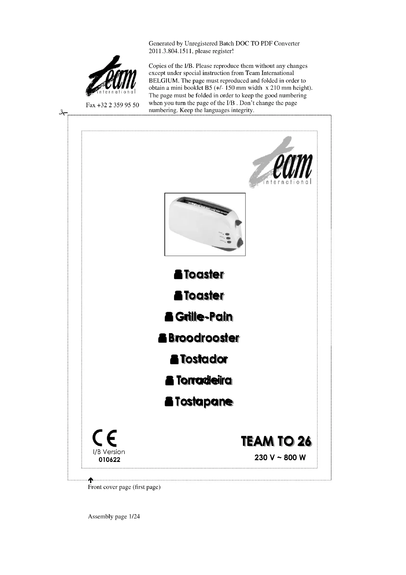 Branchez votre grille pain après avoir vérifié que le voltage de votre localité corresponde bien avec celui de votre appareil. Avant la première utilisation faire chauffer l'appareil à vide, ceci afin d'évacuer tout résidus possibles dû à la fabrication. Pour régler le temps de cuissons, utilisez le thermostat prévu à cet effet sur le coté de l'appareil. Lorsque le pain est positionné dans son compartiment poussez la manette vers le bas. L'appareil s'arrête dès que le pain est grillé et les tranches de pain remontent automatiquement. Si vous désirez interrompre la procédure en cours d'utilisation il vous suffit d'appuyer simplement sur le bouton "CANCEL". Si vous désirez réchauffer du pain, il suffit de pousser sur le bouton "REHEAT". Si vous désirez décongeler du pain, il suffit de pousser sur le bouton "DEFROST". NETTOYAGE Débranchez l'appareil et laissez-le refroidir. Pour enlever les miettes utilisez le ramasse miettes. Tirez sur la manette située sur le coté en bas de l'appareil et videz-le régulièrement. Nettoyez l’extérieur avec un chiffon sec uniquement. NE JAMAIS UTILISER CET APPAREIL PRES DE L’EAU, NE JAMAIS PLONGER L’APPAREIL DANS DE L’EAU OU TOUT AUTRE LIQUIDE. Aucune responsabilité ne peut être engagée pour des détériorations dues à une utilisation inappropriée ou non conforme au mode d’emploi. La garantie devient caduque si l’appareil a été ouvert ou endommagé.Generated by Unregistered Batch DOC TO PDF Converter 2011.3.804.1511, please register! Copies of the I/B. Please reproduce them without any changes except under special instruction from Team International BELGIUM. The page must reproduced and folded in order to obtain a mini booklet B5 (+/- 150 mm width x 210 mm height). The page must be folded in order to keep the good numbering when you turn the page of the I/B . Don’t change the page numbering. Keep the languages integrity.
