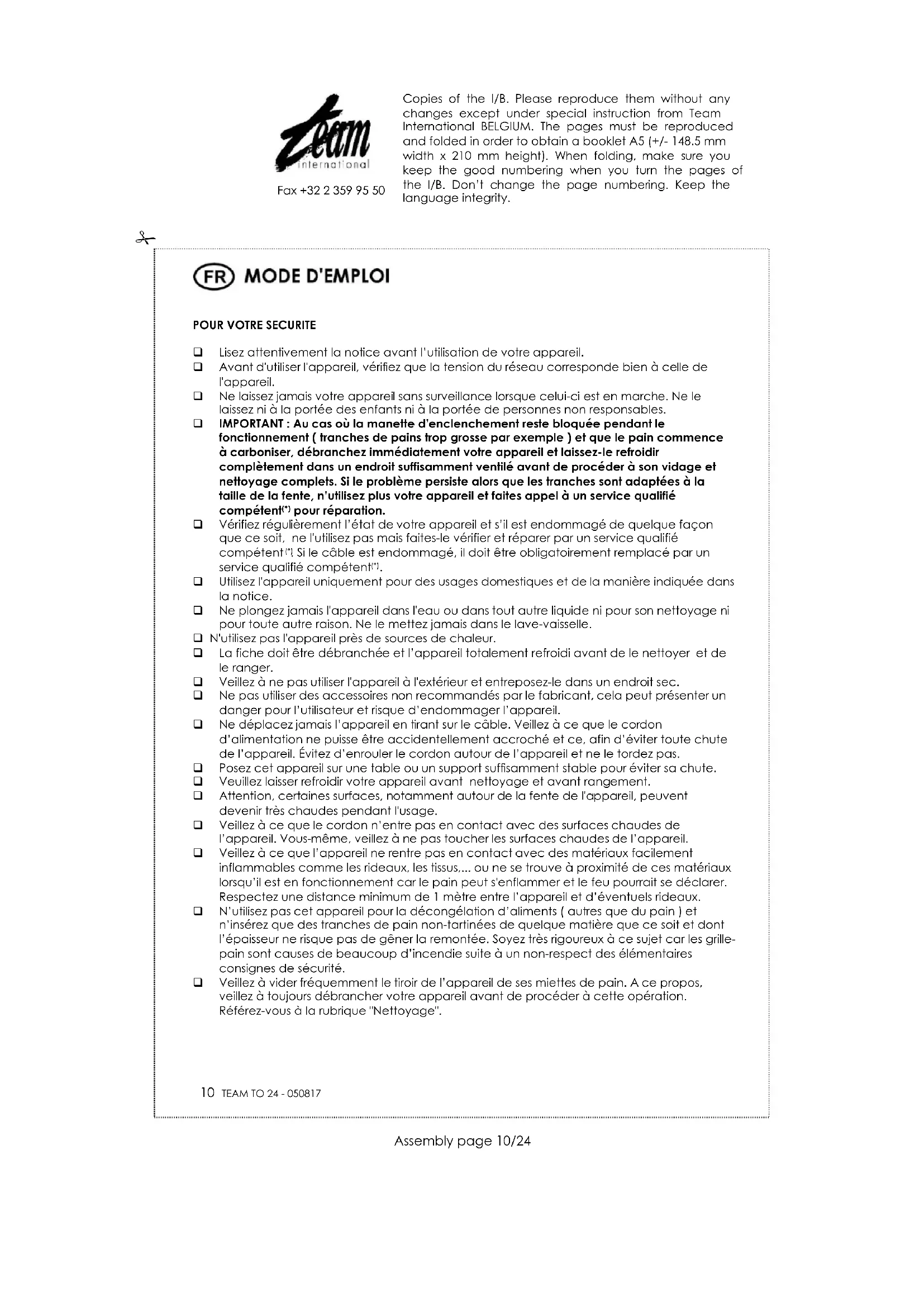 Utilisez l'appareil uniquement pour des usages domestiques et de la manière indiquée dans la notice. Ne plongez jamais l'appareil dans l'eau ou dans tout autre liquide ni pour son nettoyage ni pour toute autre raison. Ne le mettez jamais dans le lave-vaisselle. N'utilisez pas l'appareil près de sources de chaleur. La fiche doit être débranchée et l’appareil totalement refroidi avant de le nettoyer et de le ranger. Veillez à ne pas utiliser l'appareil à l'extérieur et entreposez-le dans un endroit sec. Ne pas utiliser des accessoires non recommandés par le fabricant, cela peut présenter un danger pour l’utilisateur et risque d’endommager l’appareil. Ne déplacez jamais l’appareil en tirant sur le câble. Veillez à ce que le cordon d’alimentation ne puisse être accidentellement accroché et ce, afin d’éviter toute chute de l’appareil. Évitez d’enrouler le cordon autour de l’appareil et ne le tordez pas. Posez cet appareil sur une table ou un support suffisamment stable pour éviter sa chute. Veuillez laisser refroidir votre appareil avant nettoyage et avant rangement. Attention, certaines surfaces, notamment autour de la fente de l'appareil, peuvent devenir très chaudes pendant l'usage. Veillez à ce que le cordon n’entre pas en contact avec des surfaces chaudes de l’appareil. Vous-même, veillez à ne pas toucher les surfaces chaudes de l’appareil. Veillez à ce que l’appareil ne rentre pas en contact avec des matériaux facilement inflammables comme les rideaux, les tissus,... ou ne se trouve à proximité de ces matériaux lorsqu’il est en fonctionnement car le pain peut s'enflammer et le feu pourrait se déclarer. Respectez une distance minimum de 1 mètre entre l’appareil et d’éventuels rideaux. N’utilisez pas cet appareil pour la décongélation d’aliments ( autres que du pain ) et n’insérez que des tranches de pain non-tartinées de quelque matière que ce soit et dont l’épaisseur ne risque pas de gêner la remontée. Soyez très rigoureux à ce sujet car les grille- pain sont causes de beaucoup d’incendie suite à un non-respect des élémentaires consignes de sécurité. Veillez à vider fréquemment le tiroir de l’appareil de ses miettes de pain. A ce propos, veillez à toujours débrancher votre appareil avant de procéder à cette opération. Référez-vous à la rubrique "Nettoyage". Copies of the I/B. Please reproduce them without any changes except under special instruction from Team International BELGIUM. The pages must be reproduced and folded in order to obtain a booklet A5 (+/- 148.5 mm width x 210 mm height). When folding, make sure you keep the good numbering when you turn the pages of the I/B. Don’t change the page numbering. Keep the language integrity.