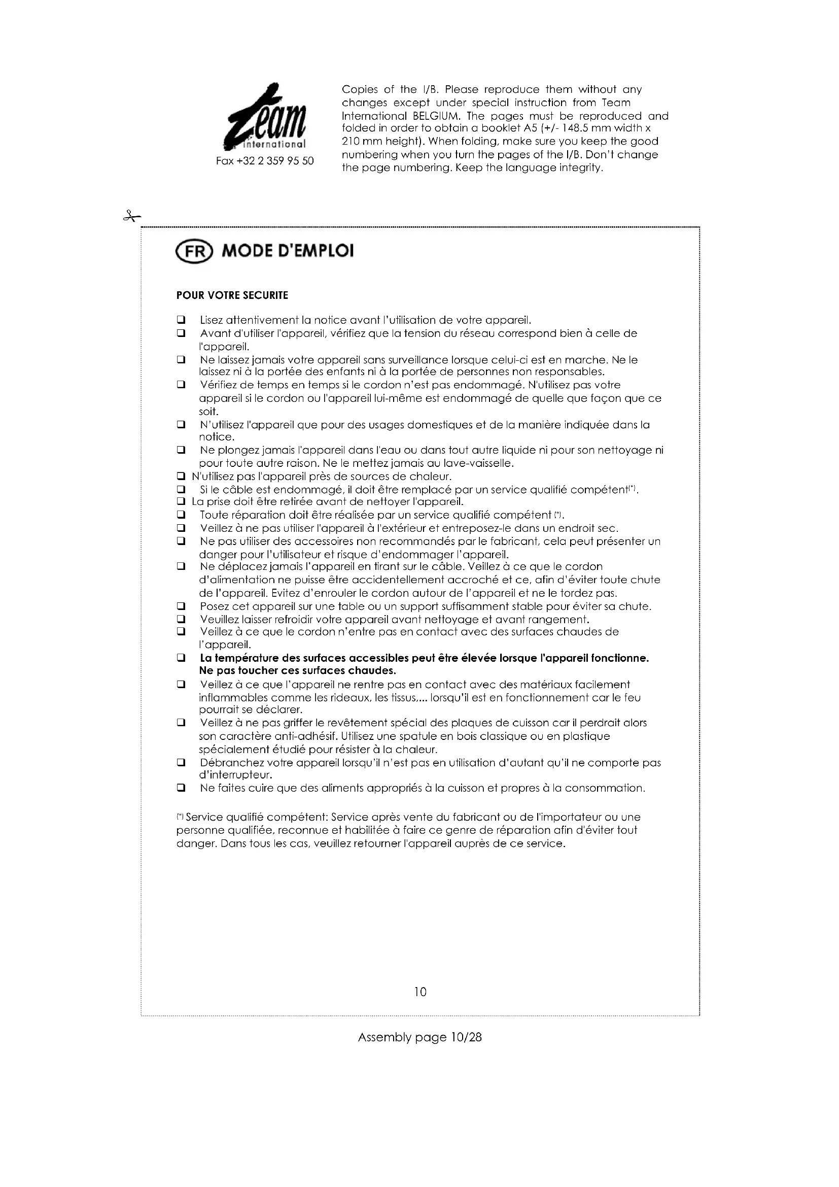 1) Service qualifié compétent: Service après vente du fabricant ou de l'importateur ou une personne qualifiée, reconnue et habilitée à faire ce genre de réparation afin d'éviter tout danger. Dans tous les cas, veuillez retourner l'appareil auprès de ce service.