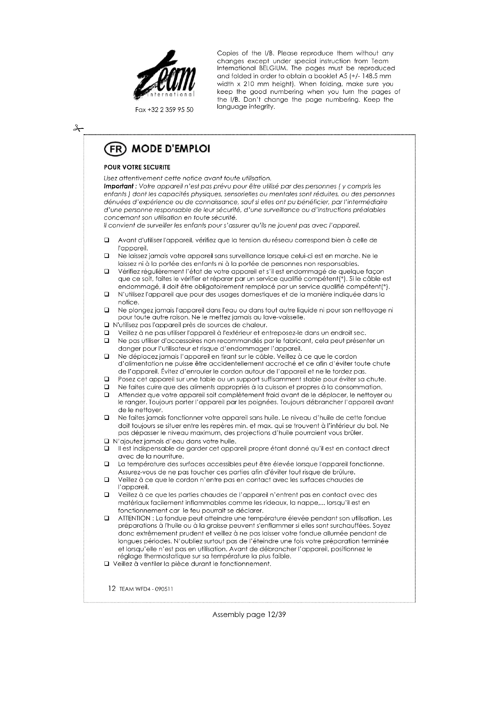 Afin de préserver notre environnement et notre santé, l’élimination en fin de vie des appareils électriques et électroniques doit se faire selon des règles bien précises et nécessite l’implication de chacun, qu’il soit fournisseur ou utilisateur. C’est pour cette raison que votre appareil, tel que le signale le symbole apposé sur sa plaque signalétique ou sur l'emballage, ne doit en aucun cas être jeté dans une poubelle publique ou privée destinée aux ordures ménagères. L'utilisateur a le droit de déposer l'appareil dans des lieux publics de collecte procédant à un tri sélectif des déchets pour être soit recyclé, soit réutilisé pour d’autres applications conformément à la directive. Copies of the I/B. Please reproduce them without any changes except under special instruction from Team International BELGIUM. The pages must be reproduced and folded in order to obtain a booklet A5 (+/- 148.5 mm width x 210 mm height). When folding, make sure you keep the good numbering when you turn the pages of the I/B. Don’t change the page numbering. Keep the language integrity.