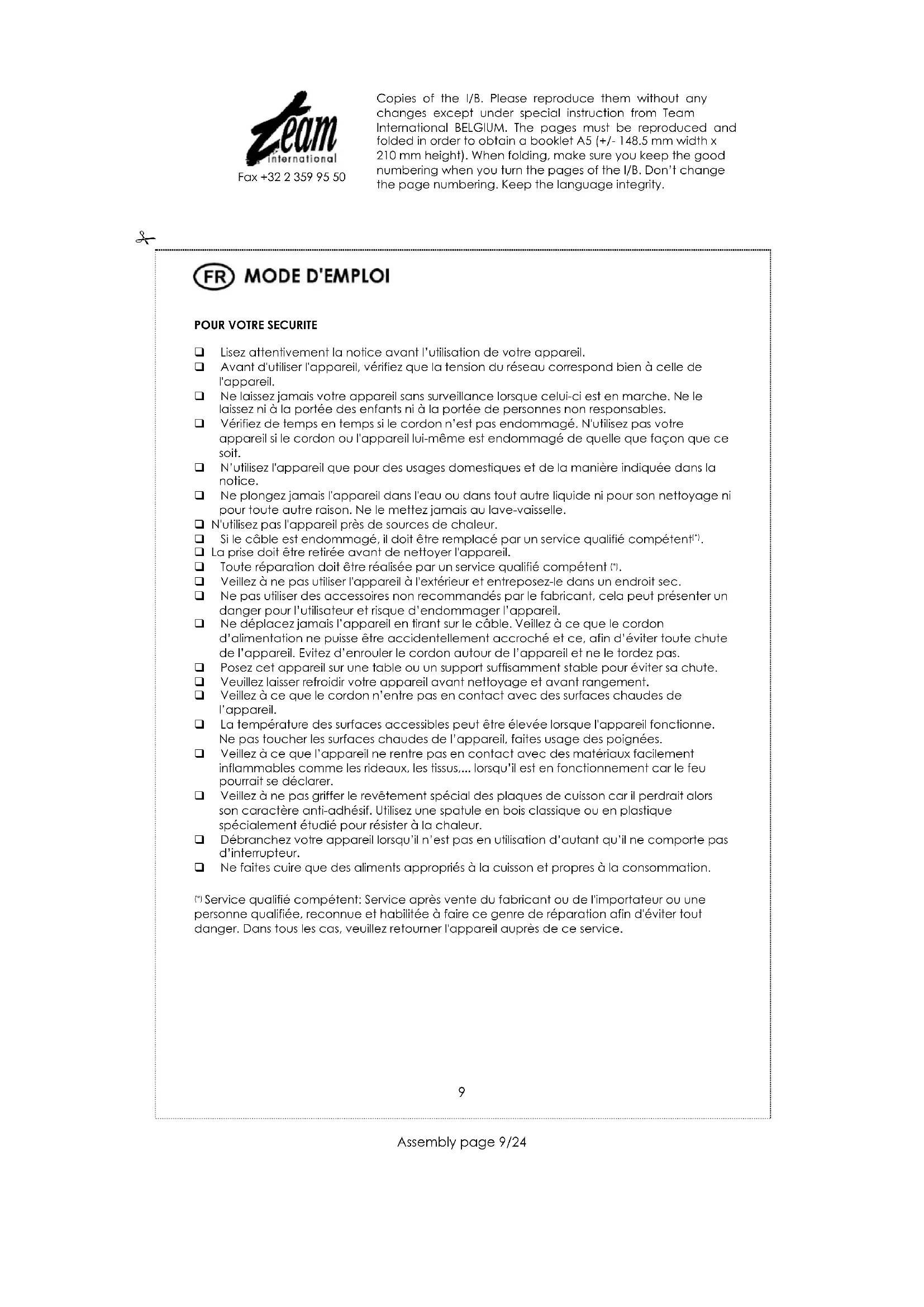 1) Service qualifié compétent: Service après vente du fabricant ou de l'importateur ou une personne qualifiée, reconnae et habilitée à faire ce genre de réparation afin d'éviter tout danger. Dans tous les cas, veuillez returner l'appareil auprès de ce service.