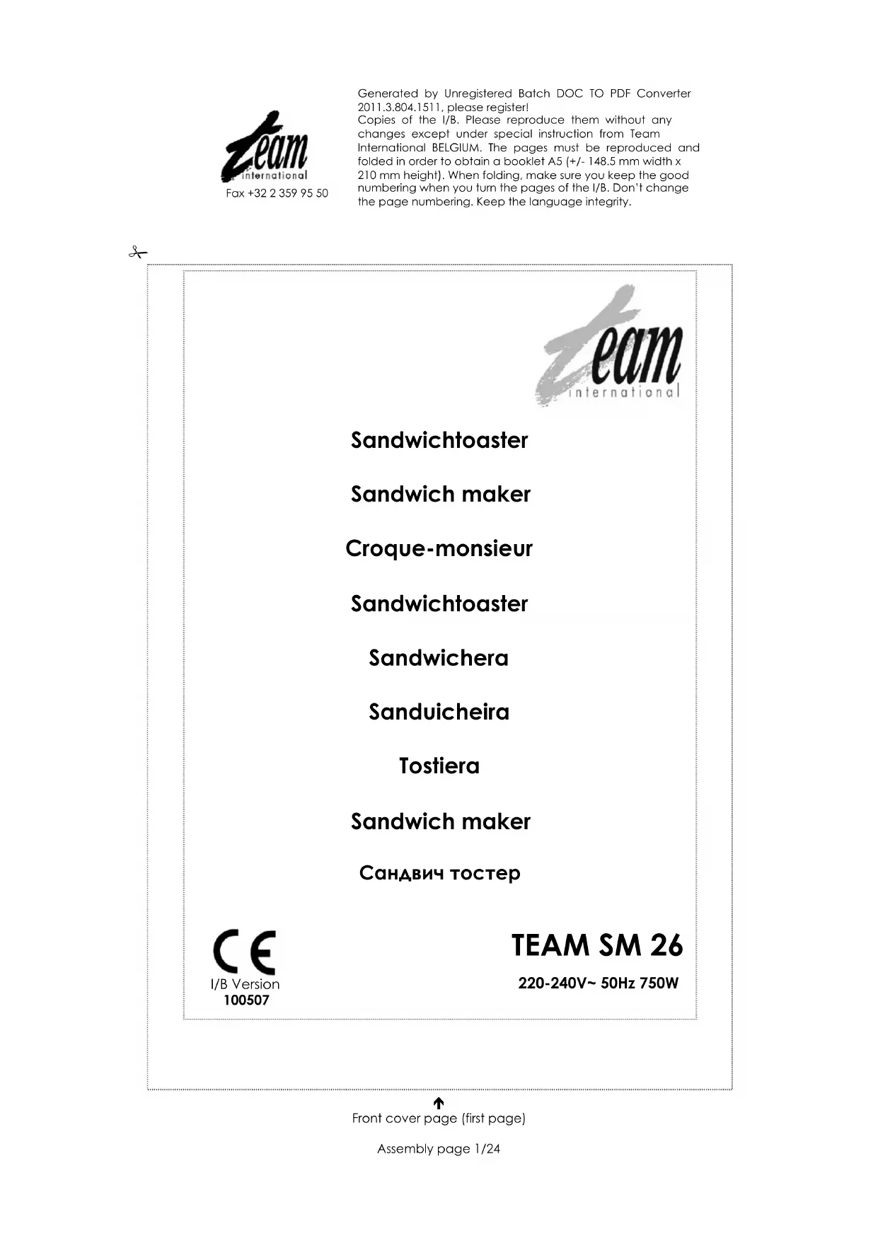 Afin de préserver notre environnement et notre santé, l’élimination en fin de vie des appareils électriques et électroniques doit se faire selon des règles bien précises et nécessite l’implication de chacun, qu’il soit fournisseur ou utilisateur. C’est pour cette raison que votre appareil, tel que le signale le symbole apposé sur sa plaque signalétique ou sur l'emballage, ne doit en aucun cas être jeté dans une poubelle publique ou privée destinée aux ordures ménagères. L'utilisateur a le droit de déposer l'appareil dans des lieux publics de collecte procédant à un tri sélectif des déchets pour être soit recyclé, soit réutilisé pour d’autres applications conformément à la directive. Copies of the I/B. Please reproduce them without any changes except under special instruction from Team International BELGIUM. The pages must be reproduced and folded in order to obtain a booklet A5 (+/- 148.5 mm width x 210 mm height). When folding, make sure you keep the good numbering when you turn the pages of the I/B. Don’t change the page numbering. Keep the language integrity.