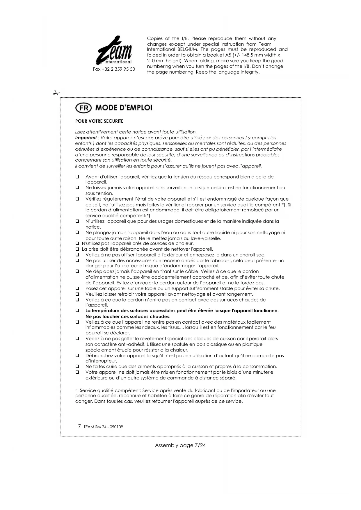 Service qualifié compétent: Service après vente du fabricant ou de l'importateur ou une personne qualifiée, reconnue et habilitée à faire ce genre de réparation afin d'éviter tout danger. Dans tous les cas, veuillez retourner l'appareil auprès de ce service. Copies of the I/B. Please reproduce them without any changes except under special instruction from Team International BELGIUM. The pages must be reproduced and folded in order to obtain a booklet A5 (+/- 148.5 mm width x 210 mm height). When folding, make sure you keep the good numbering when you turn the pages of the I/B. Don’t change the page numbering. Keep the language integrity.