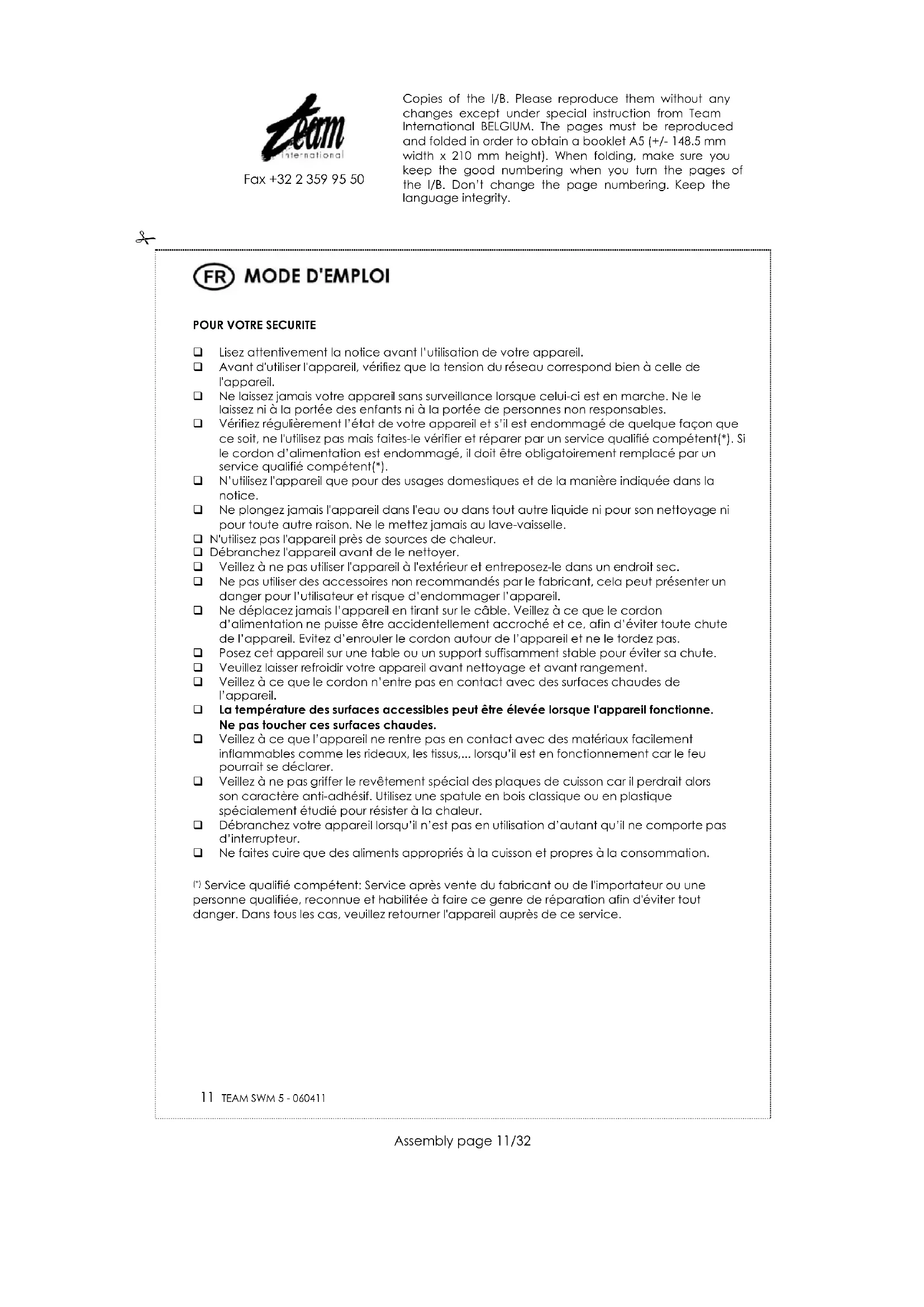 Service qualifié compétent: Service après vente du fabricant ou de l'importateur ou une personne qualifiée, reconnue et habilitée à faire ce genre de réparation afin d'éviter tout danger. Dans tous les cas, veuillez retourner l'appareil auprès de ce service. Copies of the I/B. Please reproduce them without any changes except under special instruction from Team International BELGIUM. The pages must be reproduced and folded in order to obtain a booklet A5 (+/- 148.5 mm width x 210 mm height). When folding, make sure you keep the good numbering when you turn the pages of the I/B. Don’t change the page numbering. Keep the language integrity.