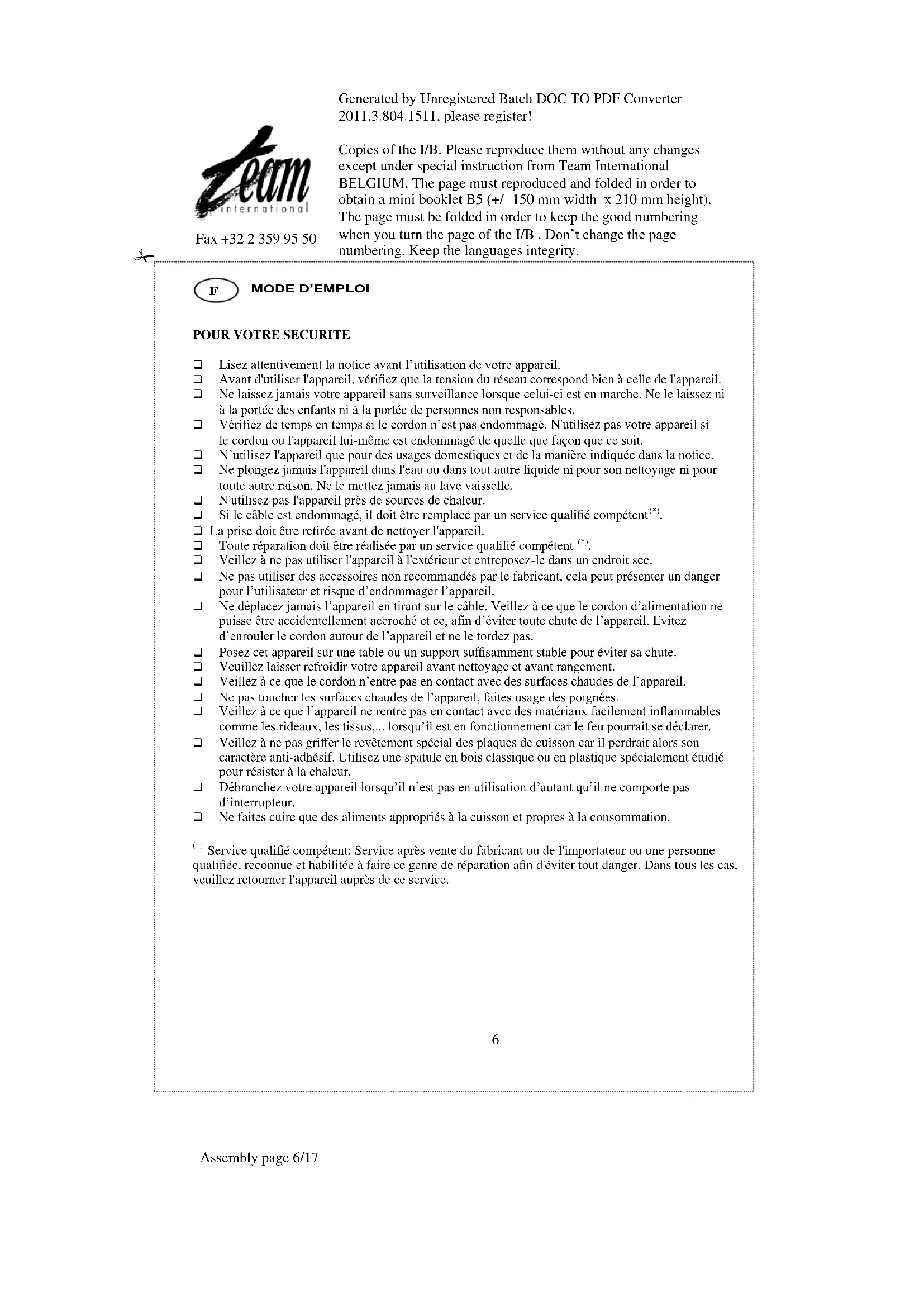 Préchauffez toujours l’appareil avant de l’employer. Branchez l’appareil pendant votre préparation des croque-monsieur. Le beurre aromatisé peut également être utilisé. Frottez du lard gras sur les tranches de pain qui rôtissent pour en accentuer le goût. NETTOYAGE Veuillez retirer la fiche de la prise de courant et attendre que l’appareil refroidisse totalement avant de le nettoyer. Essuyez l’intérieur et les angles de l’appareil à l’aide de papier absorbant ou d’un chiffon doux. Essuyez l’extérieur de l’appareil à l’aide d’un chiffon légèrement humide, en vous assurant que l'humidité, l’huile ou la graisse ne s’infiltre pas dans les aérations de refroidissement de l’appareil. Ne nettoyez jamais votre appareil (extérieur et intérieur) à l’aide de produits abrasifs car cela abîmerait le revêtement. N'immergez pas l'appareil dans l'eau ou tout autre liquide.Generated by Unregistered Batch DOC TO PDF Converter 2011.3.804.1511, please register! Copies of the I/B. Please reproduce them without any changes except under special instruction from Team International BELGIUM. The page must reproduced and folded in order to obtain a mini booklet B5 (+/- 150 mm width x 210 mm height). The page must be folded in order to keep the good numbering when you turn the page of the I/B . Don’t change the page numbering. Keep the languages integrity.