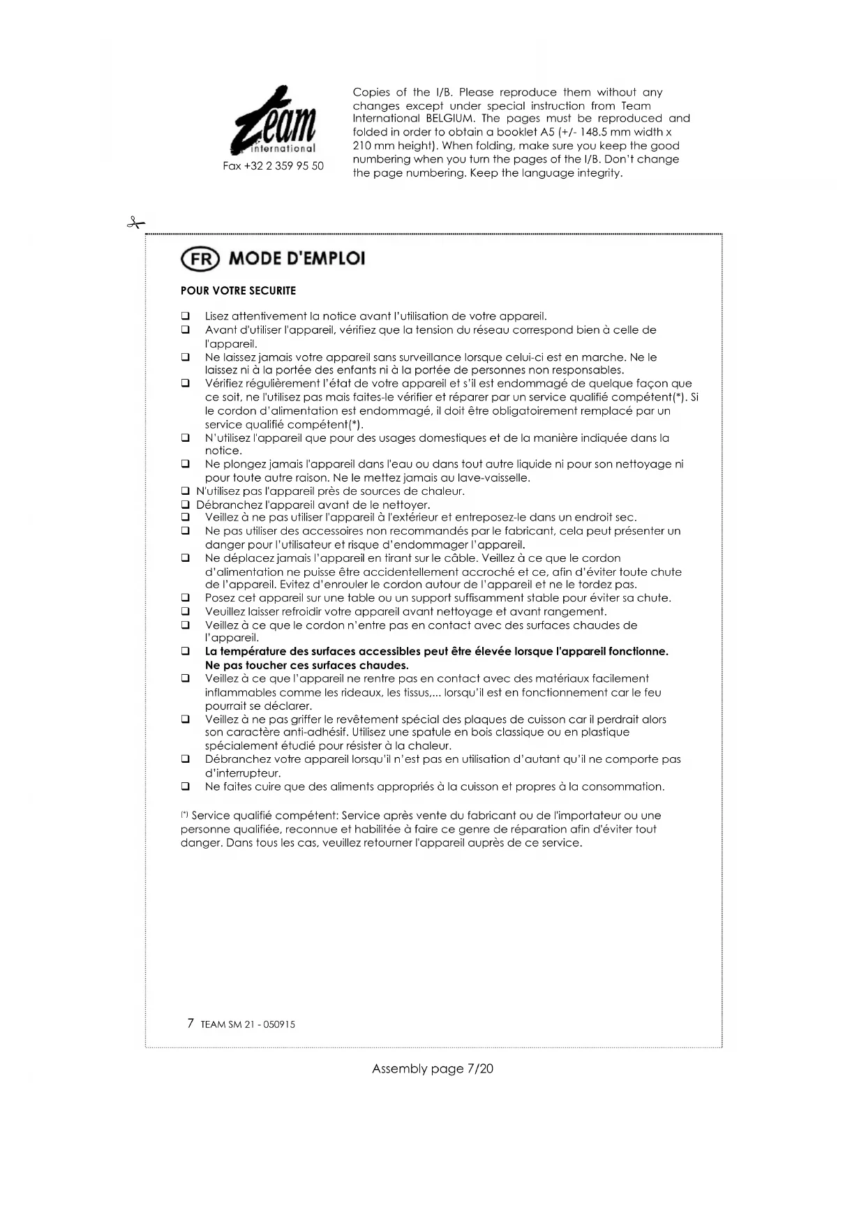 Service qualifié compétent: Service après vente du fabricant ou de l'importateur ou une personne qualifiée, reconnue et habilitée à faire ce genre de réparation afin d'éviter tout danger. Dans tous les cas, veuillez retourner l'appareil auprès de ce service. Copies of the I/B. Please reproduce them without any changes except under special instruction from Team International BELGIUM. The pages must be reproduced and folded in order to obtain a booklet A5 (+/- 148.5 mm width x 210 mm height). When folding, make sure you keep the good numbering when you turn the pages of the I/B. Don’t change the page numbering. Keep the language integrity.