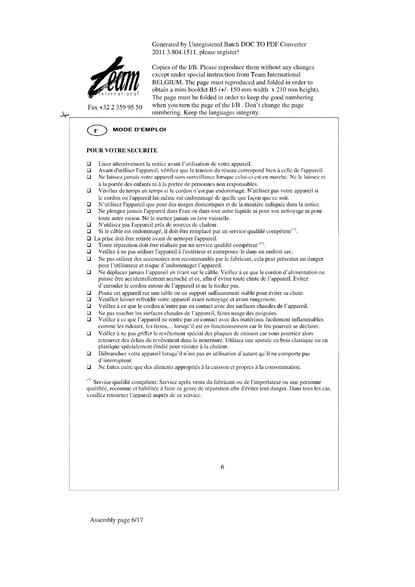 Préchauffez toujours l’appareil avant de l’employer. Branchez l’appareil pendant votre préparation des croque-monsieur. Le beurre aromatisé peut également être utilisé. Frottez du lard gras sur les tranches de pain qui rôtissent pour en accentuer le goût. NETTOYAGE Veuillez retirer la fiche de la prise de courant et attendre que l’appareil refroidisse avant de le nettoyer. Essuyez l’intérieur et les angles de l’appareil à l’aide de papier absorbant ou d’un chiffon doux. Essuyez l’extérieur de l’appareil à l’aide d’un chiffon légèrement humide, en vous assurant que l'humidité, l’huile ou la graisse ne s’infiltre pas dans les aérations de refroidissement de l’appareil. Ne nettoyez jamais votre appareil (extérieur et intérieur) à l’aide de produits abrasifs car cela abîmerait le revêtement. N'immergez pas l'appareil dans l'eau ou tout autre liquide.Generated by Unregistered Batch DOC TO PDF Converter 2011.3.804.1511, please register! Copies of the I/B. Please reproduce them without any changes except under special instruction from Team International BELGIUM. The page must reproduced and folded in order to obtain a mini booklet B5 (+/- 150 mm width x 210 mm height). The page must be folded in order to keep the good numbering when you turn the page of the I/B . Don’t change the page numbering. Keep the languages integrity.