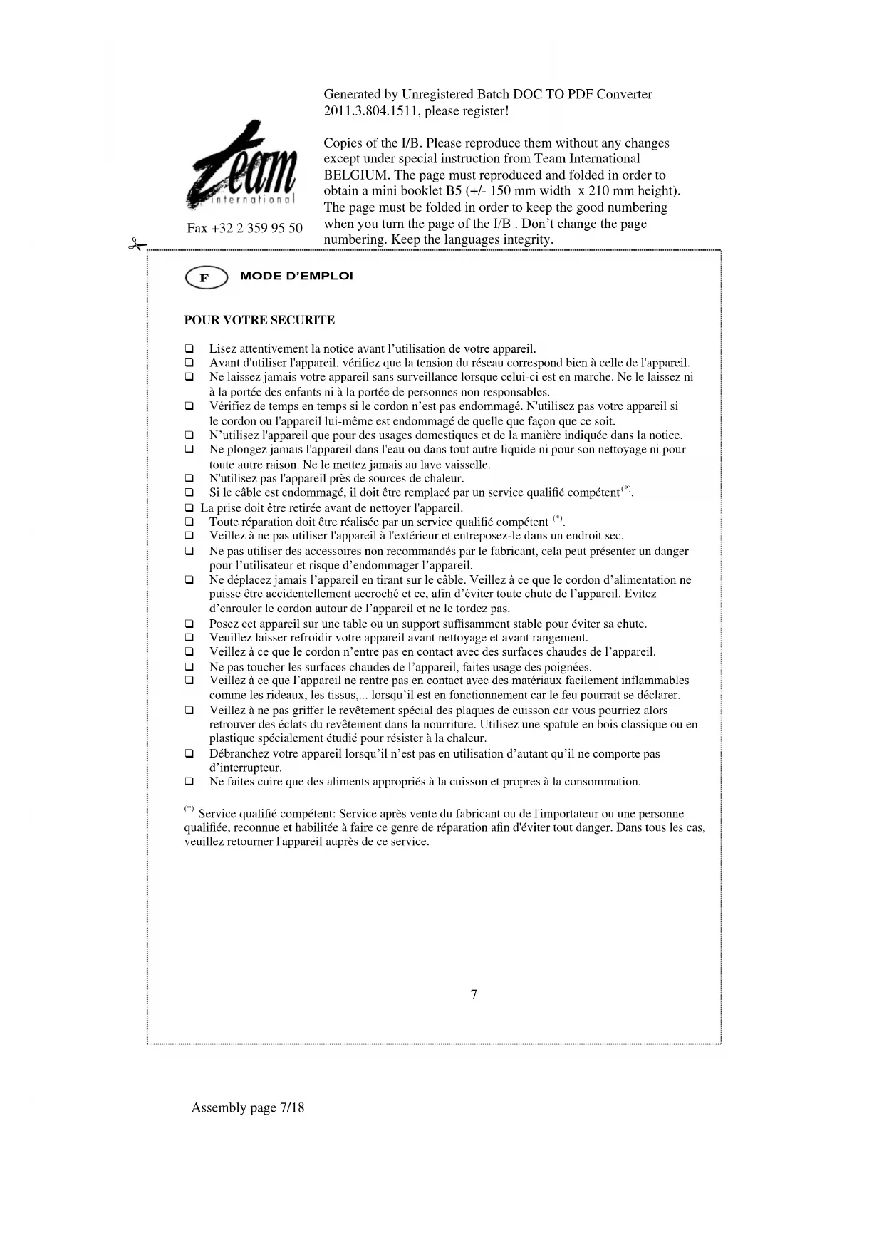 MODE D'EMPLOI SM 15 T TEAM
