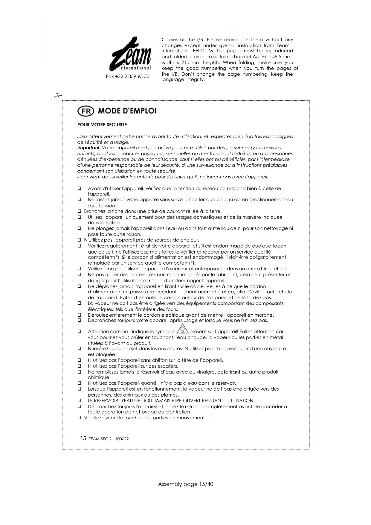 Afin de préserver notre environnement et notre santé, l’élimination en fin de vie des appareils électriques et électroniques doit se faire selon des règles bien précises et nécessite l’implication de chacun, qu’il soit fournisseur ou utilisateur. C’est pour cette raison que votre appareil, tel que le signale le symbole apposé sur sa plaque signalétique ou sur l'emballage, ne doit en aucun cas être jeté dans une poubelle publique ou privée destinée aux ordures ménagères. L'utilisateur a le droit de déposer l'appareil dans des lieux publics de collecte procédant à un tri sélectif des déchets pour être soit recyclé, soit réutilisé pour d’autres applications conformément à la directive. Copies of the I/B. Please reproduce them without any changes except under special instruction from Team International BELGIUM. The pages must be reproduced and folded in order to obtain a booklet A5 (+/- 148.5 mm width x 210 mm height). When folding, make sure you keep the good numbering when you turn the pages of the I/B. Don’t change the page numbering. Keep the language integrity.