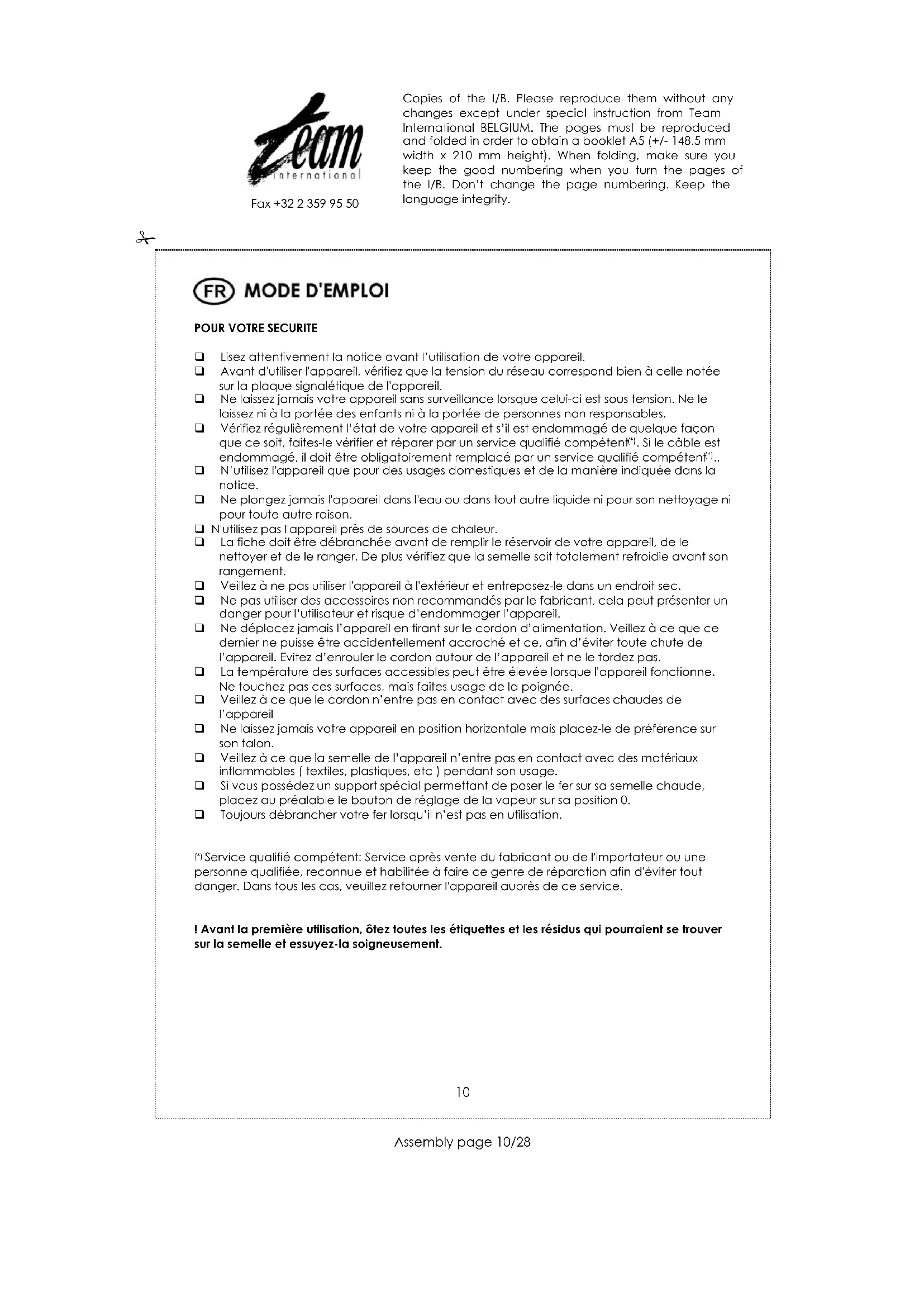 Fax +32 2 359 95 50 AVANT DE RANGER VOTRE FER A REPASSER Placez le bouton du thermostat sur la position "0" et débranchez la fiche de la prise de courant. Videz le réservoir en tenant le sommet vers le bas et en évitant de mettre la semelle face à vous. Ensuite placez-le en position verticale sur son talon de façon à le laisser refroidir et ainsi laisser l'humidité s'évaporer librement pour éviter toute forme de moisissure. Une fois la semelle totalement froide, vous pouvez ranger votre fer. Copies of the I/B. Please reproduce them without any changes except under special instruction from Team International BELGIUM. The pages must be reproduced and folded in order to obtain a booklet A5 (+/- 148.5 mm width x 210 mm height). When folding, make sure you keep the good numbering when you turn the pages of the I/B. Don‟t change the page numbering. Keep the language integrity.