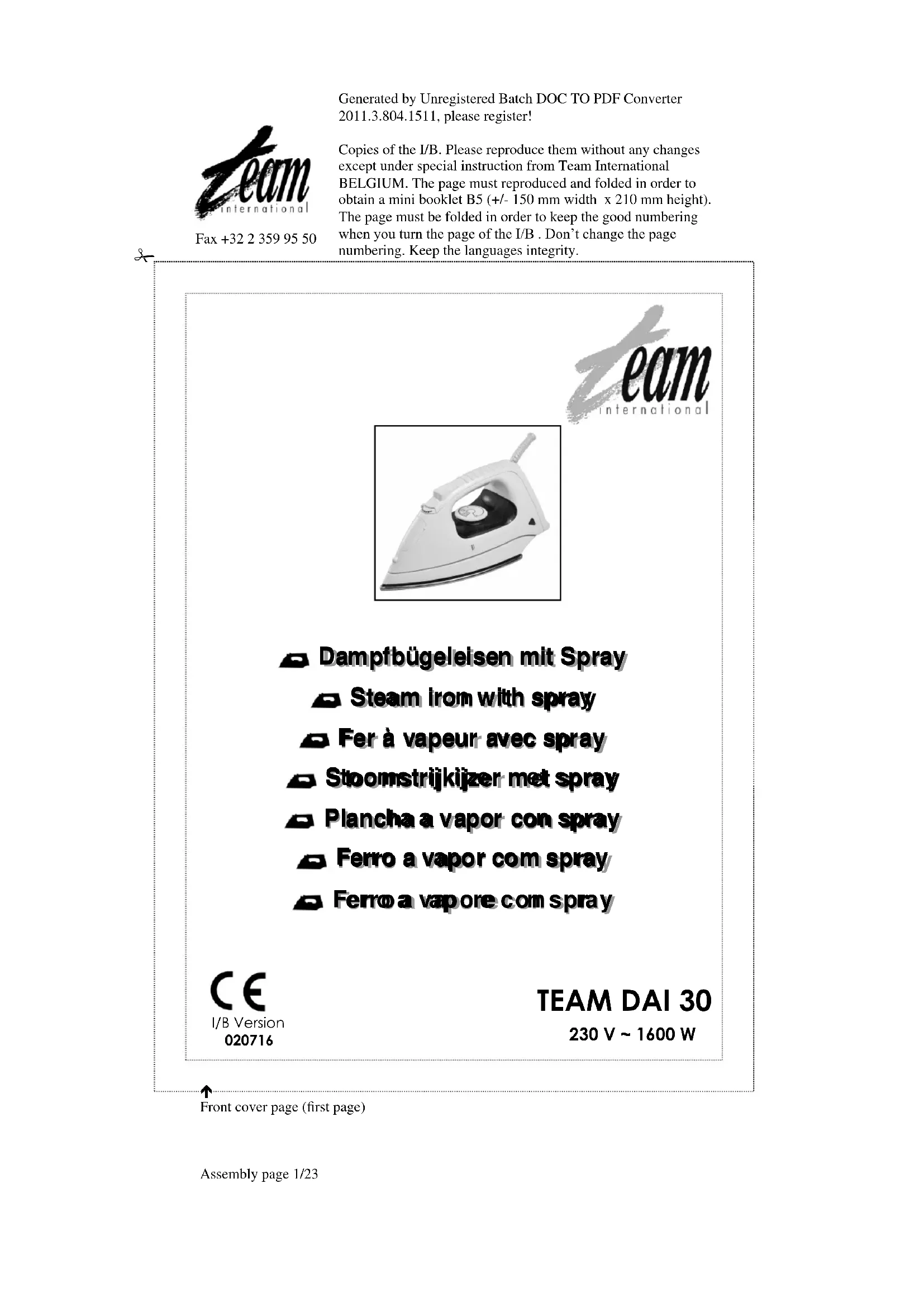 Service qualifié compétent: Service après vente du fabricant ou de l'importateur ou une personne qualifiée, reconnue et habilitée à faire ce genre de réparation afin d'éviter tout danger. Dans tous les cas, veuillez retourner l'appareil auprès de ce service. ! Avant la première utilisation, ôtez toutes les étiquettes et les résidus qui pourraient se trouver sur la semelle et essuyez-la soigneusement.Generated by Unregistered Batch DOC TO PDF Converter 2011.3.804.1511, please register! Copies of the I/B. Please reproduce them without any changes except under special instruction from Team International BELGIUM. The page must reproduced and folded in order to obtain a mini booklet B5 (+/- 150 mm width x 210 mm height). The page must be folded in order to keep the good numbering when you turn the page of the I/B . Don’t change the page numbering. Keep the languages integrity.