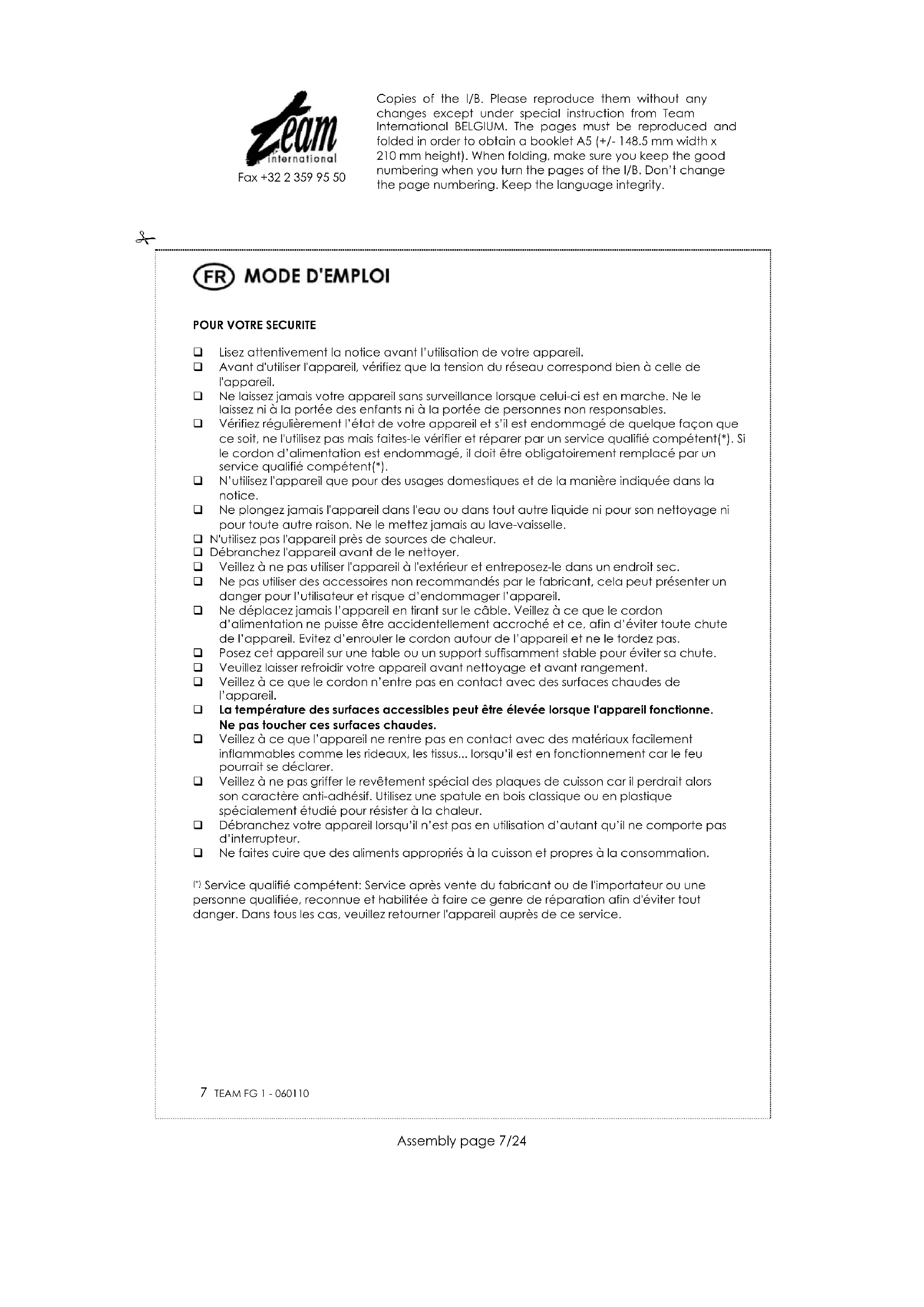 Service qualifié compétent: Service après vente du fabricant ou de l'importateur ou une personne qualifiée, reconnue et habilitée à faire ce genre de réparation afin d'éviter tout danger. Dans tous les cas, veuillez retourner l'appareil auprès de ce service. Copies of the I/B. Please reproduce them without any changes except under special instruction from Team International BELGIUM. The pages must be reproduced and folded in order to obtain a booklet A5 (+/- 148.5 mm width x 210 mm height). When folding, make sure you keep the good numbering when you turn the pages of the I/B. Don’t change the page numbering. Keep the language integrity.