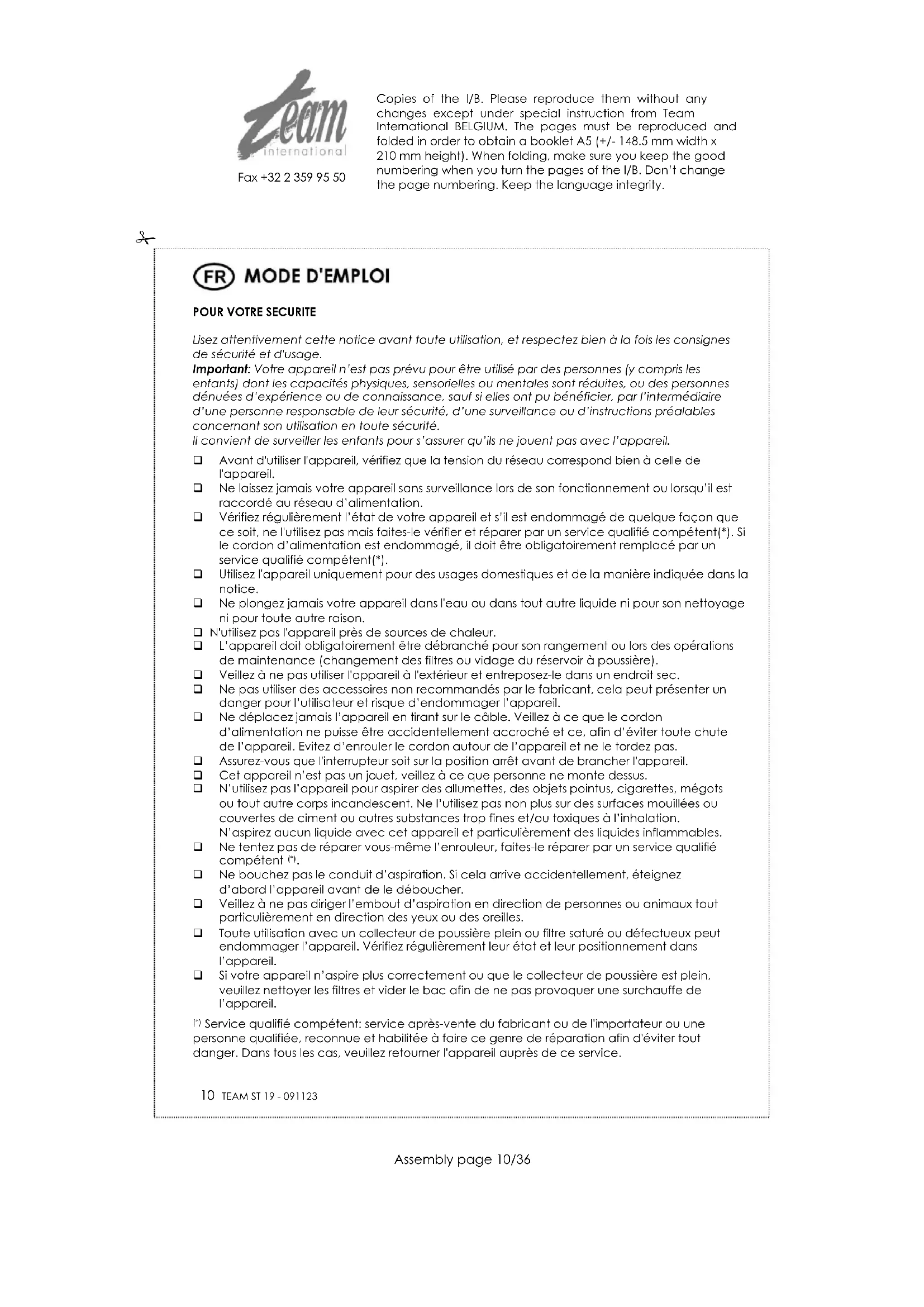 Afin de préserver notre environnement et notre santé, l’élimination en fin de vie des appareils électriques et électroniques doit se faire selon des règles bien précises et nécessite l’implication de chacun, qu’il soit fournisseur ou utilisateur. C’est pour cette raison que votre appareil, tel que le signale le symbole apposé sur sa plaque signalétique ou sur l'emballage, ne doit en aucun cas être jeté dans une poubelle publique ou privée destinée aux ordures ménagères. L'utilisateur a le droit de déposer l'appareil dans des lieux publics de collecte procédant à un tri sélectif des déchets pour être soit recyclé, soit réutilisé pour d’autres applications conformément à la directive. Copies of the I/B. Please reproduce them without any changes except under special instruction from Team International BELGIUM. The pages must be reproduced and folded in order to obtain a booklet A5 (+/- 148.5 mm width x 210 mm height). When folding, make sure you keep the good numbering when you turn the pages of the I/B. Don’t change the page numbering. Keep the language integrity.