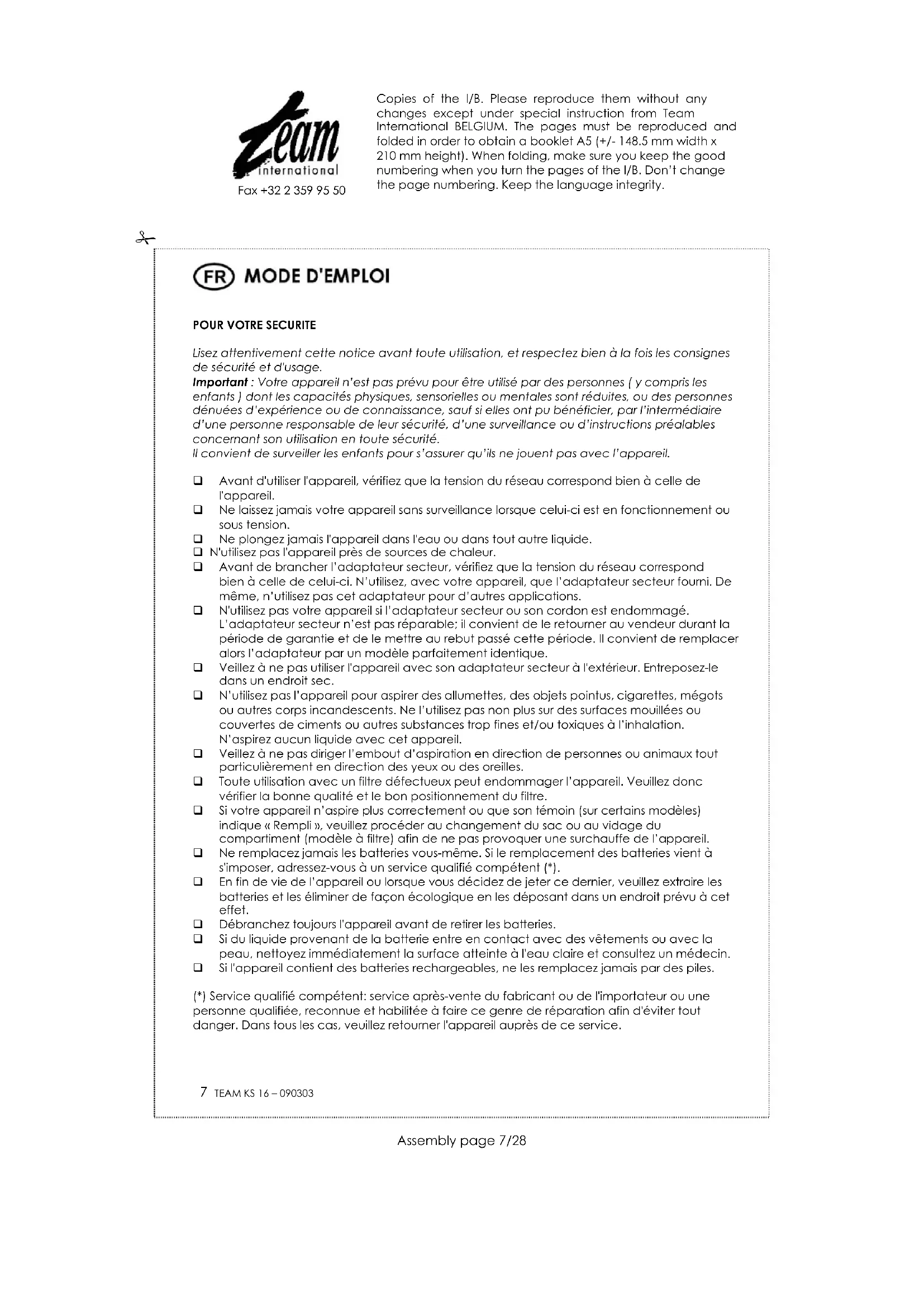 Lisez attentivement cette notice avant toute utilisation, et respectez bien à la fois les consignes de sécurité et d'usage. Important : Votre appareil n’est pas prévu pour être utilisé par des personnes ( y compris les enfants ) dont les capacités physiques, sensorielles ou mentales sont réduites, ou des personnes dénuées d’expérience ou de connaissance, sauf si elles ont pu bénéficier, par l’intermédiaire d’une personne responsable de leur sécurité, d’une surveillance ou d’instructions préalables concernant son utilisation en toute sécurité. Il convient de surveiller les enfants pour s’assurer qu’ils ne jouent pas avec l’appareil. Avant d'utiliser l'appareil, vérifiez que la tension du réseau correspond bien à celle de l'appareil. Ne laissez jamais votre appareil sans surveillance lorsque celui-ci est en fonctionnement ou sous tension. Ne plongez jamais l'appareil dans l'eau ou dans tout autre liquide. N'utilisez pas l'appareil près de sources de chaleur. Avant de brancher l’adaptateur secteur, vérifiez que la tension du réseau correspond bien à celle de celui-ci. N’utilisez, avec votre appareil, que l’adaptateur secteur fourni. De même, n’utilisez pas cet adaptateur pour d’autres applications. N'utilisez pas votre appareil si l’adaptateur secteur ou son cordon est endommagé. L’adaptateur secteur n’est pas réparable; il convient de le retourner au vendeur durant la période de garantie et de le mettre au rebut passé cette période. Il convient de remplacer alors l’adaptateur par un modèle parfaitement identique. Veillez à ne pas utiliser l'appareil avec son adaptateur secteur à l'extérieur. Entreposez-le dans un endroit sec. N’utilisez pas l’appareil pour aspirer des allumettes, des objets pointus, cigarettes, mégots ou autres corps incandescents. Ne l’utilisez pas non plus sur des surfaces mouillées ou couvertes de ciments ou autres substances trop fines et/ou toxiques à l’inhalation. N’aspirez aucun liquide avec cet appareil. Veillez à ne pas diriger l’embout d’aspiration en direction de personnes ou animaux tout particulièrement en direction des yeux ou des oreilles. Toute utilisation avec un filtre défectueux peut endommager l’appareil. Veuillez donc vérifier la bonne qualité et le bon positionnement du filtre. Si votre appareil n’aspire plus correctement ou que son témoin (sur certains modèles) indique « Rempli », veuillez procéder au changement du sac ou au vidage du compartiment (modèle à filtre) afin de ne pas provoquer une surchauffe de l’appareil. Ne remplacez jamais les batteries vous-même. Si le remplacement des batteries vient à s'imposer, adressez-vous à un service qualifié compétent (*). En fin de vie de l’appareil ou lorsque vous décidez de jeter ce dernier, veuillez extraire les batteries et les éliminer de façon écologique en les déposant dans un endroit prévu à cet effet. Débranchez toujours l'appareil avant de retirer les batteries. Si du liquide provenant de la batterie entre en contact avec des vêtements ou avec la peau, nettoyez immédiatement la surface atteinte à l'eau claire et consultez un médecin. Si l'appareil contient des batteries rechargeables, ne les remplacez jamais par des piles. (*) Service qualifié compétent: service après-vente du fabricant ou de l'importateur ou une personne qualifiée, reconnue et habilitée à faire ce genre de réparation afin d'éviter tout danger. Dans tous les cas, veuillez retourner l'appareil auprès de ce service. Copies of the I/B. Please reproduce them without any changes except under special instruction from Team International BELGIUM. The pages must be reproduced and folded in order to obtain a booklet A5 (+/- 148.5 mm width x 210 mm height). When folding, make sure you keep the good numbering when you turn the pages of the I/B. Don’t change the page numbering. Keep the language integrity. 8 TEAM KS 16 – 090303