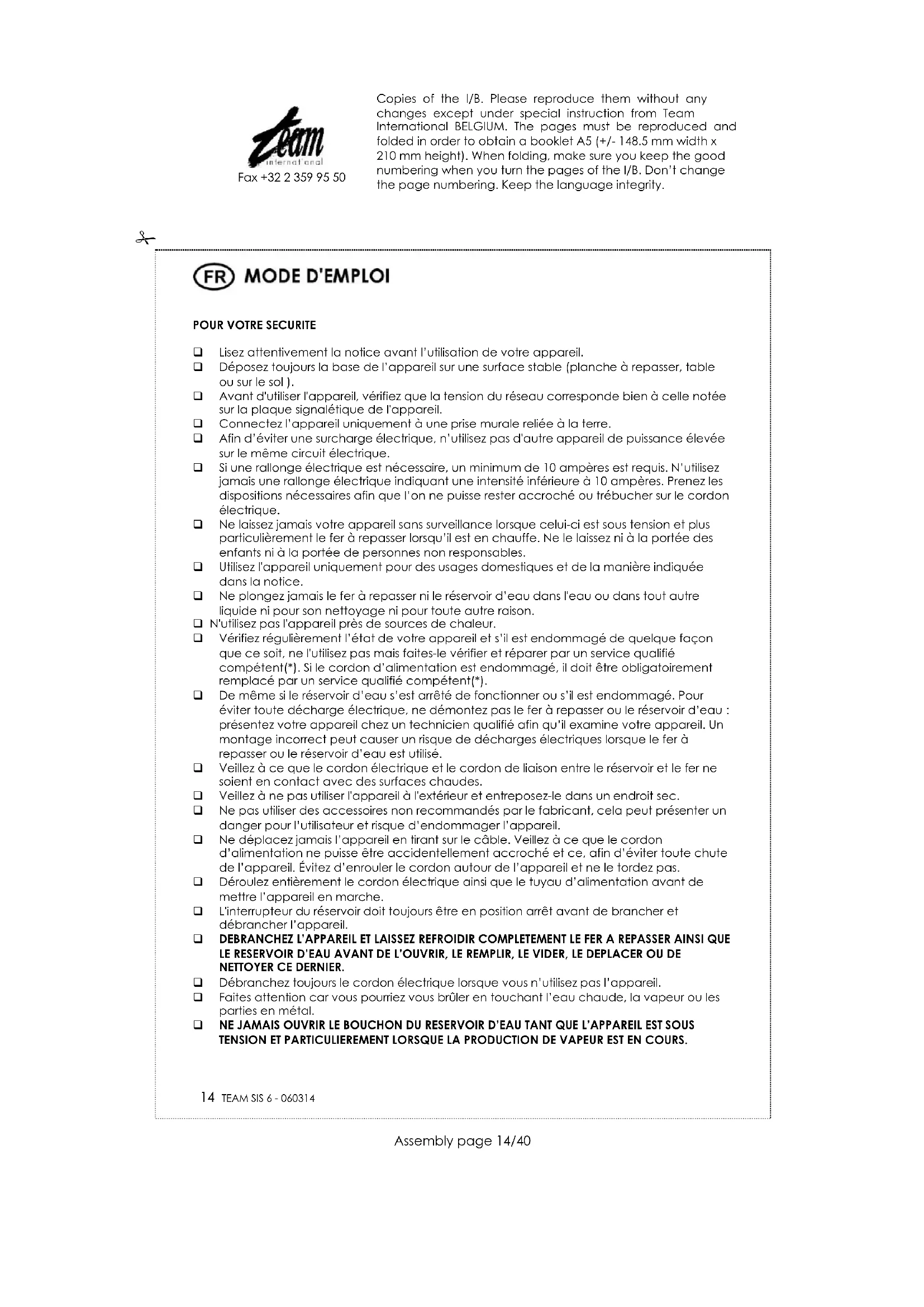 SIS 6 - Fer à repasser TEAM - Notice d'utilisation et mode d'emploi gratuit