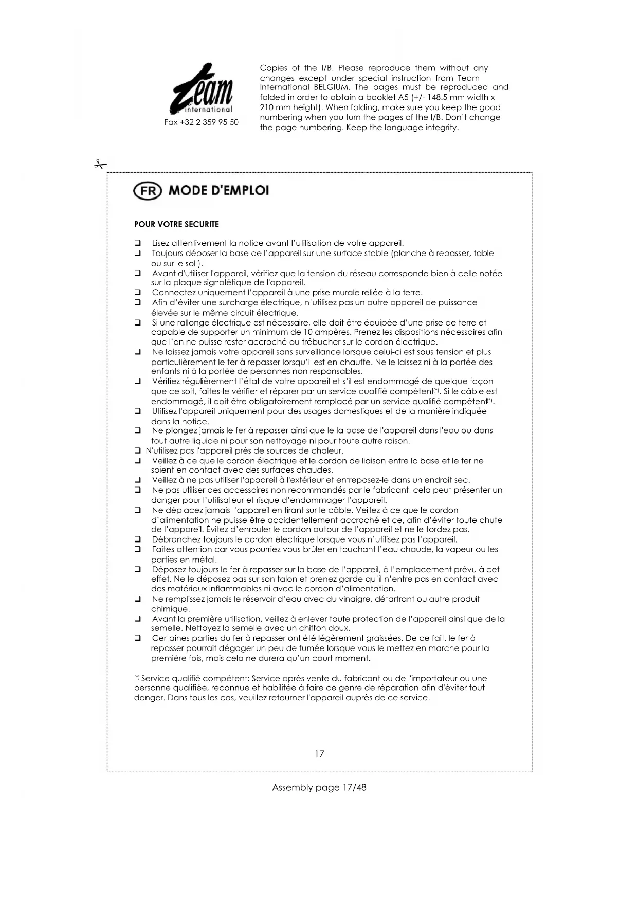 Fax +32 2 359 95 50 NETTOYAGE Les parties plastiques de l‟appareil peuvent être nettoyées avec un tissu humide. Pour nettoyer la semelle du fer, vous trouverez des produits spécifiques dans le commerce et suivez les consignes indiquées. N‟utilisez jamais d‟éponge abrasive ou équivalent. Ne plongez jamais l'appareil dans l'eau ou tout autre liquide. Copies of the I/B. Please reproduce them without any changes except under special instruction from Team International BELGIUM. The pages must be reproduced and folded in order to obtain a booklet A5 (+/- 148.5 mm width x 210 mm height). When folding, make sure you keep the good numbering when you turn the pages of the I/B. Don‟t change the page numbering. Keep the language integrity.