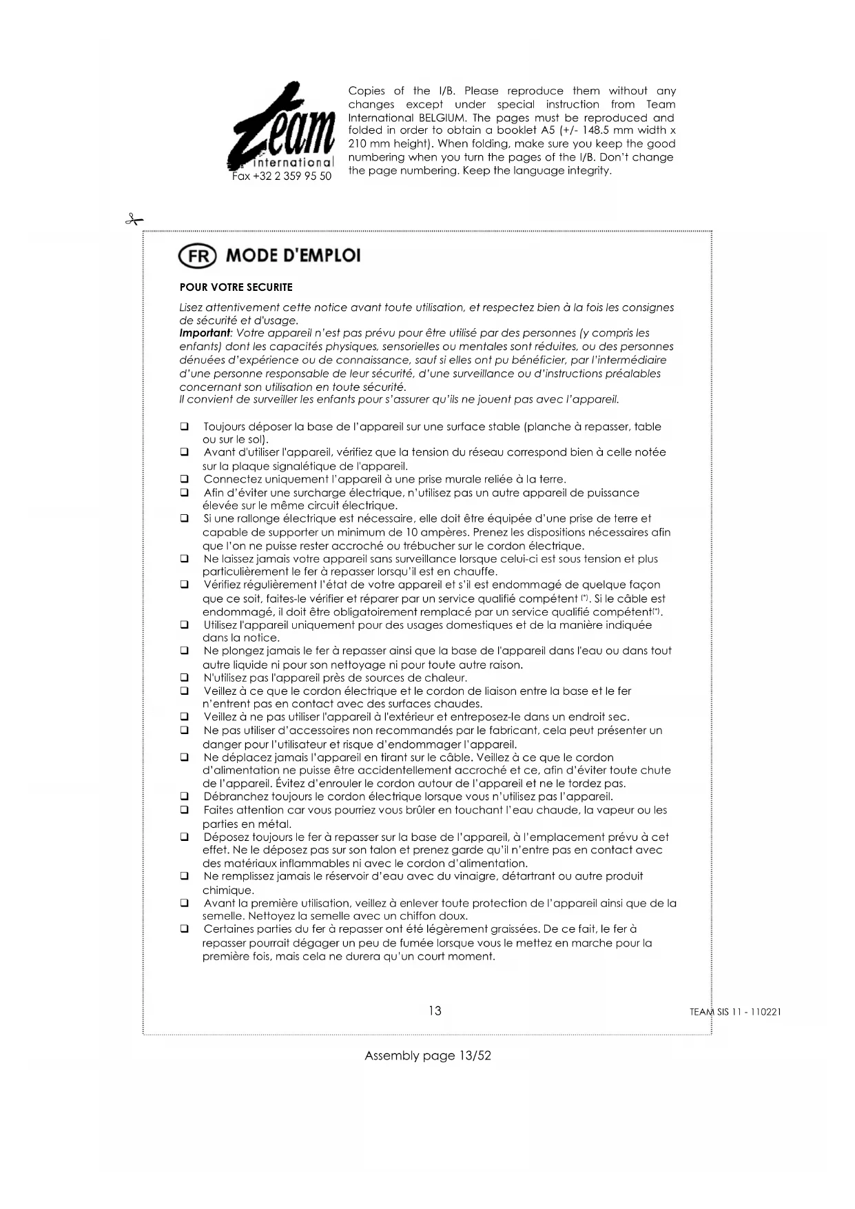Assembly page 13/52 Copies of the I/B. Please reproduce them without any changes except under special instruction from Team International BELGIUM. The pages must be reproduced and folded in order to obtain a booklet A5 (+/- 148.5 mm width x 210 mm height). When folding, make sure you keep the good numbering when you turn the pages of the I/B. Don’t change the page numbering. Keep the language integrity. Fax +32 2 359 95 50 De même si le réservoir d’eau s’est arrêté de fonctionner ou s’il est endommagé. Pour éviter toute décharge électrique, ne démontez pas le fer à repasser ou le réservoir d’eau: présentez votre appareil chez un technicien qualifié afin qu’il examine votre appareil. Un montage incorrect peut causer un risque de décharges électriques lorsque le fer à repasser ou le réservoir d’eau est utilisé. Déroulez entièrement le cordon électrique ainsi que le tuyau d’alimentation avant de mettre l’appareil en marche. L'interrupteur du réservoir doit toujours être en position arrêt avant de brancher et débrancher l’appareil. Débranchez l’appareil et laissez refroidir complètement le fer à repasser ainsi que le réservoir d’eau avant de les nettoyer et de les ranger, et pour les centrales vapeur avec chaudière (selon modèle), avant d’ouvrir, de remplir ou de vider le réservoir d’eau. POUR LES CENTRALES VAPEUR AVEC CHAUDIERE (SELON MODELE), NE JAMAIS OUVRIR LE BOUCHON DU RESERVOIR D’EAU TANT QUE L’APPAREIL EST SOUS TENSION ET PARTICULIEREMENT LORSQUE LA PRODUCTION DE VAPEUR EST EN COURS.