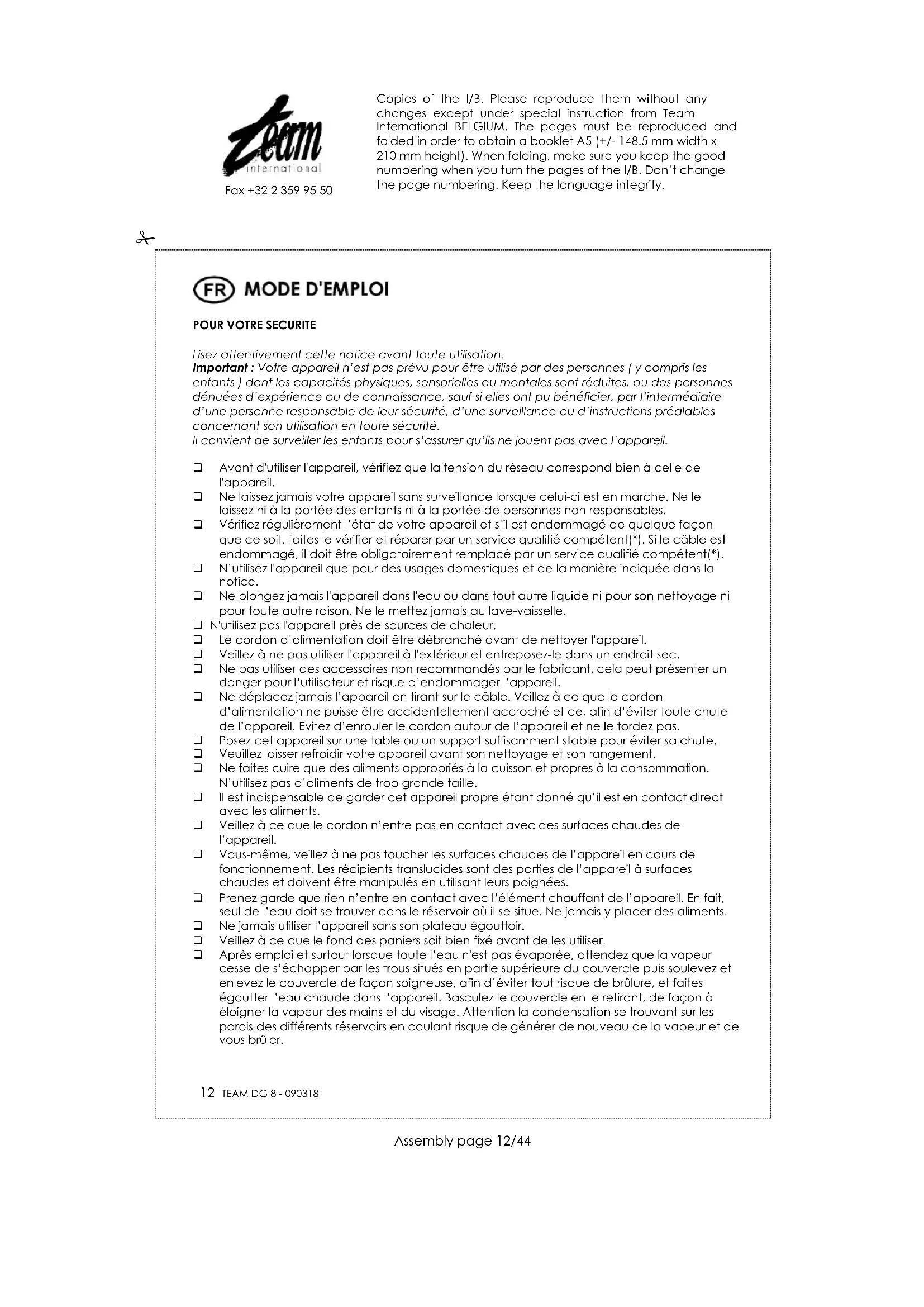 Afin de préserver notre environnement et notre santé, l’élimination en fin de vie des appareils électriques et électroniques doit se faire selon des règles bien précises et nécessite l’implication de chacun, qu’il soit fournisseur ou utilisateur. C’est pour cette raison que votre appareil, tel que le signale le symbole apposé sur sa plaque signalétique ou sur l'emballage, ne doit en aucun cas être jeté dans une poubelle publique ou privée destinée aux ordures ménagères. L'utilisateur a le droit de déposer l'appareil dans des lieux publics de collecte procédant à un tri sélectif des déchets pour être soit recyclé, soit réutilisé pour d’autres applications conformément à la directive. Copies of the I/B. Please reproduce them without any changes except under special instruction from Team International BELGIUM. The pages must be reproduced and folded in order to obtain a booklet A5 (+/- 148.5 mm width x 210 mm height). When folding, make sure you keep the good numbering when you turn the pages of the I/B. Don’t change the page numbering. Keep the language integrity.