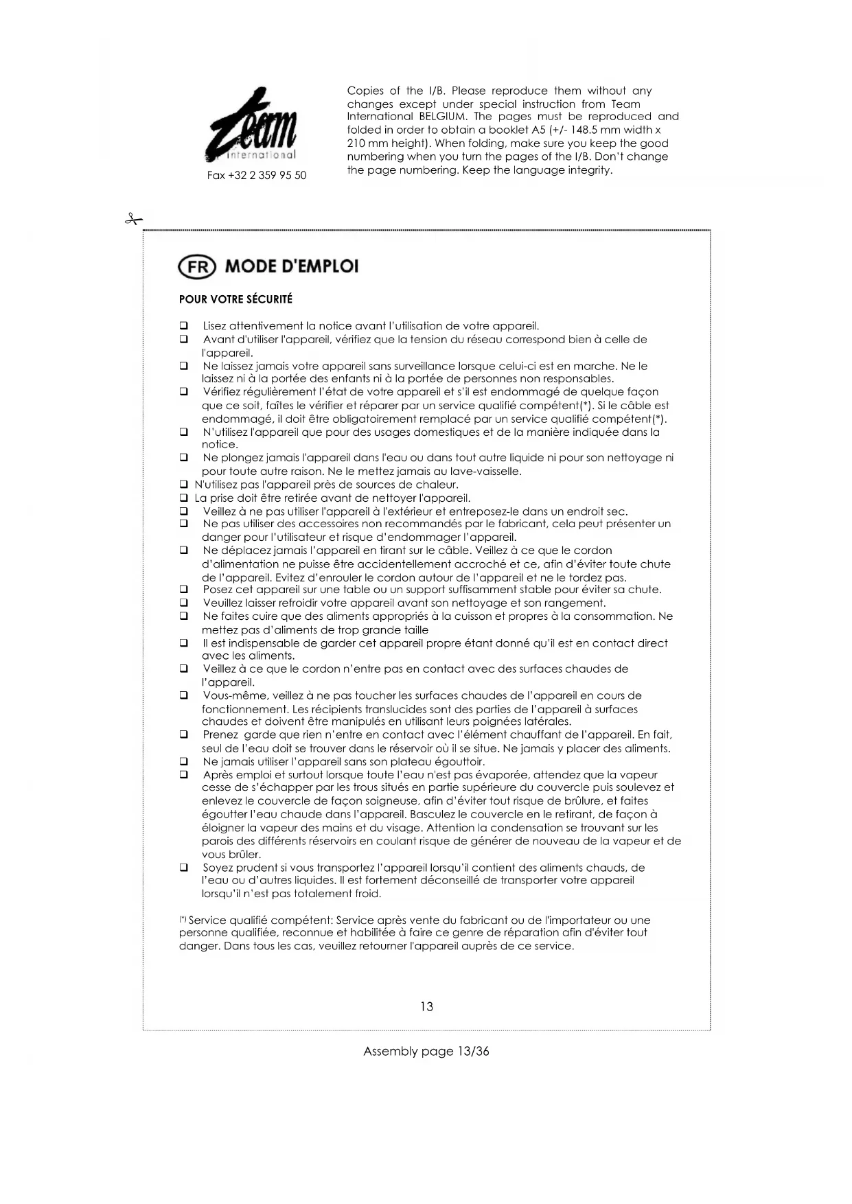 (*)Service qualifié compétent: Service après vente du fabricant ou de l'importateur ou une personne qualifiée, reconnae et habilitée à faire ce genre de réparation afin d'éviter tout danger. Dans tous les cas, veuillez returner l'appareil auprès de ce service.