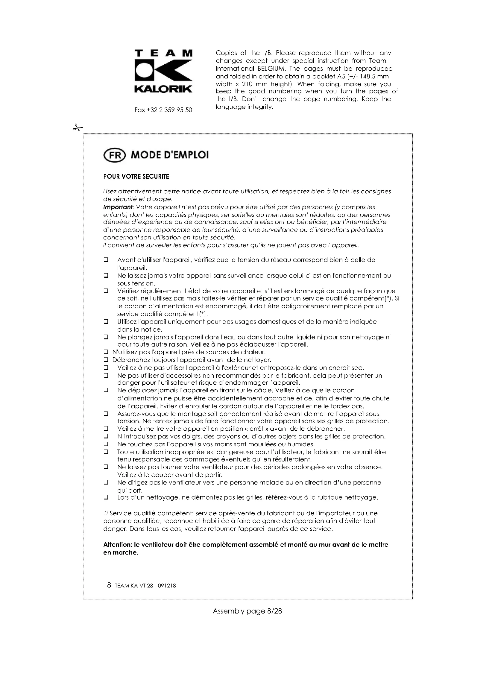 Service qualifié compétent: service après-vente du fabricant ou de l'importateur ou une personne qualifiée, reconnue et habilitée à faire ce genre de réparation afin d'éviter tout danger. Dans tous les cas, veuillez retourner l'appareil auprès de ce service. Attention: le ventilateur doit être complètement assemblé et monté au mur avant de le mettre en marche. Copies of the I/B. Please reproduce them without any changes except under special instruction from Team International BELGIUM. The pages must be reproduced and folded in order to obtain a booklet A5 (+/- 148.5 mm width x 210 mm height). When folding, make sure you keep the good numbering when you turn the pages of the I/B. Don’t change the page numbering. Keep the language integrity.