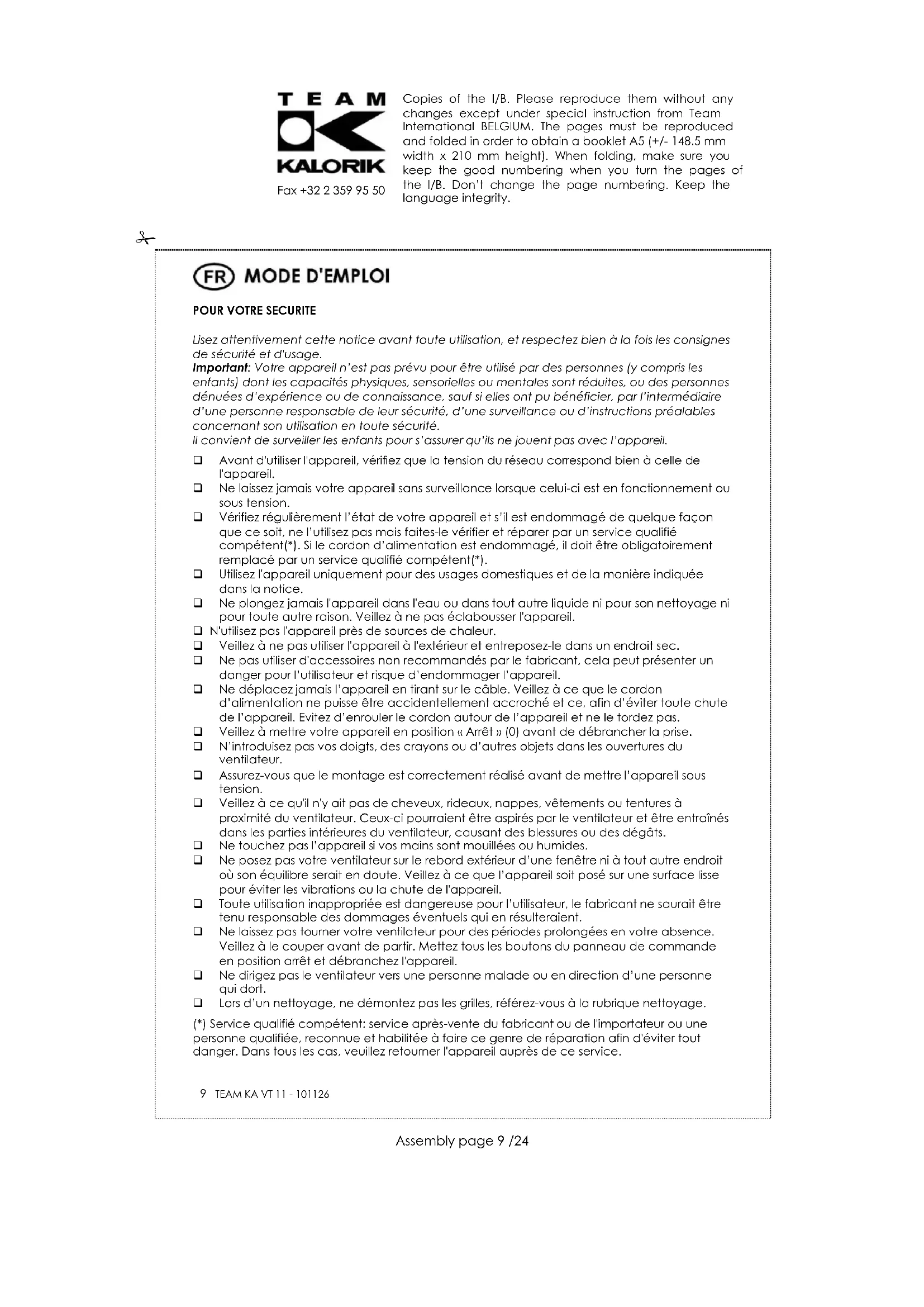 Lisez attentivement cette notice avant toute utilisation, et respectez bien à la fois les consignes de sécurité et d'usage. Important: Votre appareil n’est pas prévu pour être utilisé par des personnes (y compris les enfants) dont les capacités physiques, sensorielles ou mentales sont réduites, ou des personnes dénuées d’expérience ou de connaissance, sauf si elles ont pu bénéficier, par l’intermédiaire d’une personne responsable de leur sécurité, d’une surveillance ou d’instructions préalables concernant son utilisation en toute sécurité. Il convient de surveiller les enfants pour s’assurer qu’ils ne jouent pas avec l’appareil. Avant d'utiliser l'appareil, vérifiez que la tension du réseau correspond bien à celle de l'appareil. Ne laissez jamais votre appareil sans surveillance lorsque celui-ci est en fonctionnement ou sous tension. Vérifiez régulièrement l’état de votre appareil et s’il est endommagé de quelque façon que ce soit, ne l’utilisez pas mais faites-le vérifier et réparer par un service qualifié compétent(*). Si le cordon d’alimentation est endommagé, il doit être obligatoirement remplacé par un service qualifié compétent(*). Utilisez l'appareil uniquement pour des usages domestiques et de la manière indiquée dans la notice. Ne plongez jamais l'appareil dans l'eau ou dans tout autre liquide ni pour son nettoyage ni pour toute autre raison. Veillez à ne pas éclabousser l'appareil. N'utilisez pas l'appareil près de sources de chaleur. Veillez à ne pas utiliser l'appareil à l'extérieur et entreposez-le dans un endroit sec. Ne pas utiliser d'accessoires non recommandés par le fabricant, cela peut présenter un danger pour l’utilisateur et risque d’endommager l’appareil. Ne déplacez jamais l’appareil en tirant sur le câble. Veillez à ce que le cordon d’alimentation ne puisse être accidentellement accroché et ce, afin d’éviter toute chute de l’appareil. Evitez d’enrouler le cordon autour de l’appareil et ne le tordez pas. Veillez à mettre votre appareil en position « Arrêt » (0) avant de débrancher la prise. N’introduisez pas vos doigts, des crayons ou d’autres objets dans les ouvertures du ventilateur. Assurez-vous que le montage est correctement réalisé avant de mettre l’appareil sous tension. Veillez à ce qu'il n'y ait pas de cheveux, rideaux, nappes, vêtements ou tentures à proximité du ventilateur. Ceux-ci pourraient être aspirés par le ventilateur et être entraînés dans les parties intérieures du ventilateur, causant des blessures ou des dégâts. Ne touchez pas l’appareil si vos mains sont mouillées ou humides. Ne posez pas votre ventilateur sur le rebord extérieur d’une fenêtre ni à tout autre endroit où son équilibre serait en doute. Veillez à ce que l’appareil soit posé sur une surface lisse pour éviter les vibrations ou la chute de l'appareil. Toute utilisation inappropriée est dangereuse pour l’utilisateur, le fabricant ne saurait être tenu responsable des dommages éventuels qui en résulteraient. Ne laissez pas tourner votre ventilateur pour des périodes prolongées en votre absence. Veillez à le couper avant de partir. Mettez tous les boutons du panneau de commande en position arrêt et débranchez l'appareil. Ne dirigez pas le ventilateur vers une personne malade ou en direction d’une personne qui dort. Lors d’un nettoyage, ne démontez pas les grilles, référez-vous à la rubrique nettoyage. (*) Service qualifié compétent: service après-vente du fabricant ou de l'importateur ou une personne qualifiée, reconnue et habilitée à faire ce genre de réparation afin d'éviter tout danger. Dans tous les cas, veuillez retourner l'appareil auprès de ce service. Copies of the I/B. Please reproduce them without any changes except under special instruction from Team International BELGIUM. The pages must be reproduced and folded in order to obtain a booklet A5 (+/- 148.5 mm width x 210 mm height). When folding, make sure you keep the good numbering when you turn the pages of the I/B. Don’t change the page numbering. Keep the language integrity.