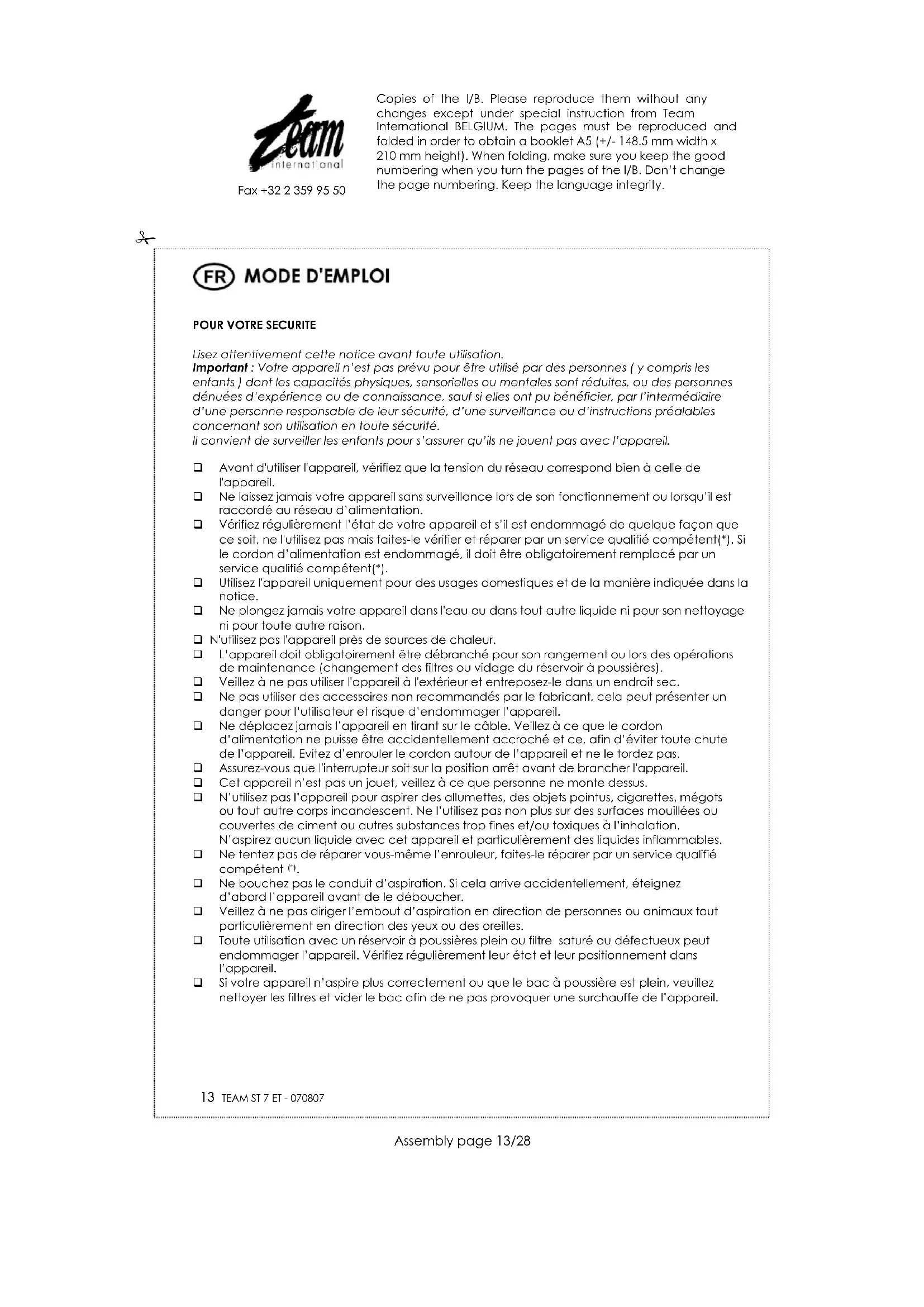 Ne bouchez pas le conduit d’aspiration. Si cela arrive accidentellement, éteignez d’abord l’appareil avant de le déboucher. Veillez à ne pas diriger l’embout d’aspiration en direction de personnes ou animaux tout particulièrement en direction des yeux ou des oreilles. Toute utilisation avec un réservoir à poussières plein ou filtre saturé ou défectueux peut endommager l’appareil. Vérifiez régulièrement leur état et leur positionnement dans l’appareil. Si votre appareil n’aspire plus correctement ou que le bac à poussière est plein, veuillez nettoyer les filtres et vider le bac afin de ne pas provoquer une surchauffe de l’appareil. Copies of the I/B. Please reproduce them without any changes except under special instruction from Team International BELGIUM. The pages must be reproduced and folded in order to obtain a booklet A5 (+/- 148.5 mm width x 210 mm height). When folding, make sure you keep the good numbering when you turn the pages of the I/B. Don’t change the page numbering. Keep the language integrity.