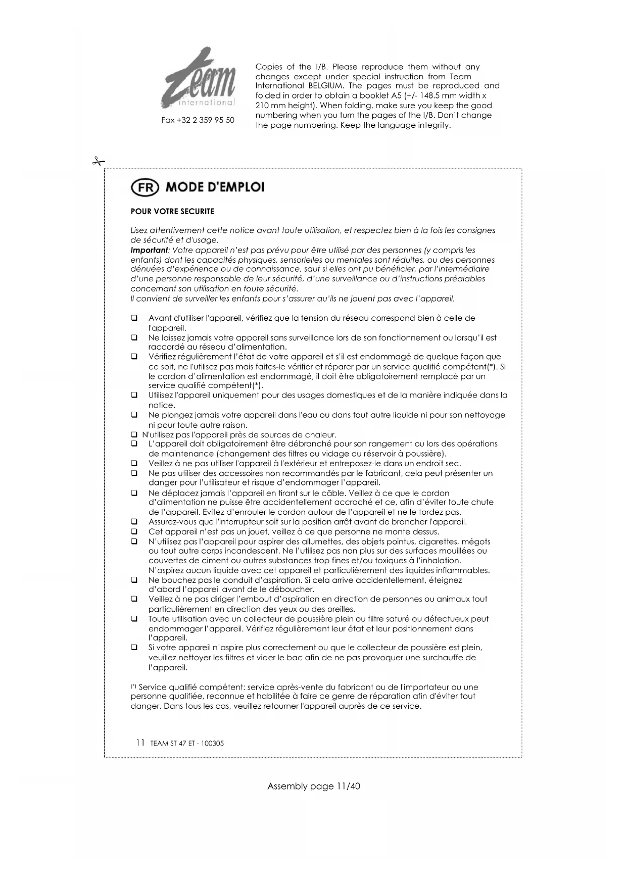 Afin de préserver notre environnement et notre santé, l‟élimination en fin de vie des appareils électriques et électroniques doit se faire selon des règles bien précises et nécessite l‟implication de chacun, qu‟il soit fournisseur ou utilisateur. C‟est pour cette raison que votre appareil, tel que le signale le symbole apposé sur sa plaque signalétique ou sur l'emballage, ne doit en aucun cas être jeté dans une poubelle publique ou privée destinée aux ordures ménagères. L'utilisateur a le droit de déposer l'appareil dans des lieux publics de collecte procédant à un tri sélectif des déchets pour être soit recyclé, soit réutilisé pour d‟autres applications conformément à la directive. Copies of the I/B. Please reproduce them without any changes except under special instruction from Team International BELGIUM. The pages must be reproduced and folded in order to obtain a booklet A5 (+/- 148.5 mm width x 210 mm height). When folding, make sure you keep the good numbering when you turn the pages of the I/B. Don‟t change the page numbering. Keep the language integrity.