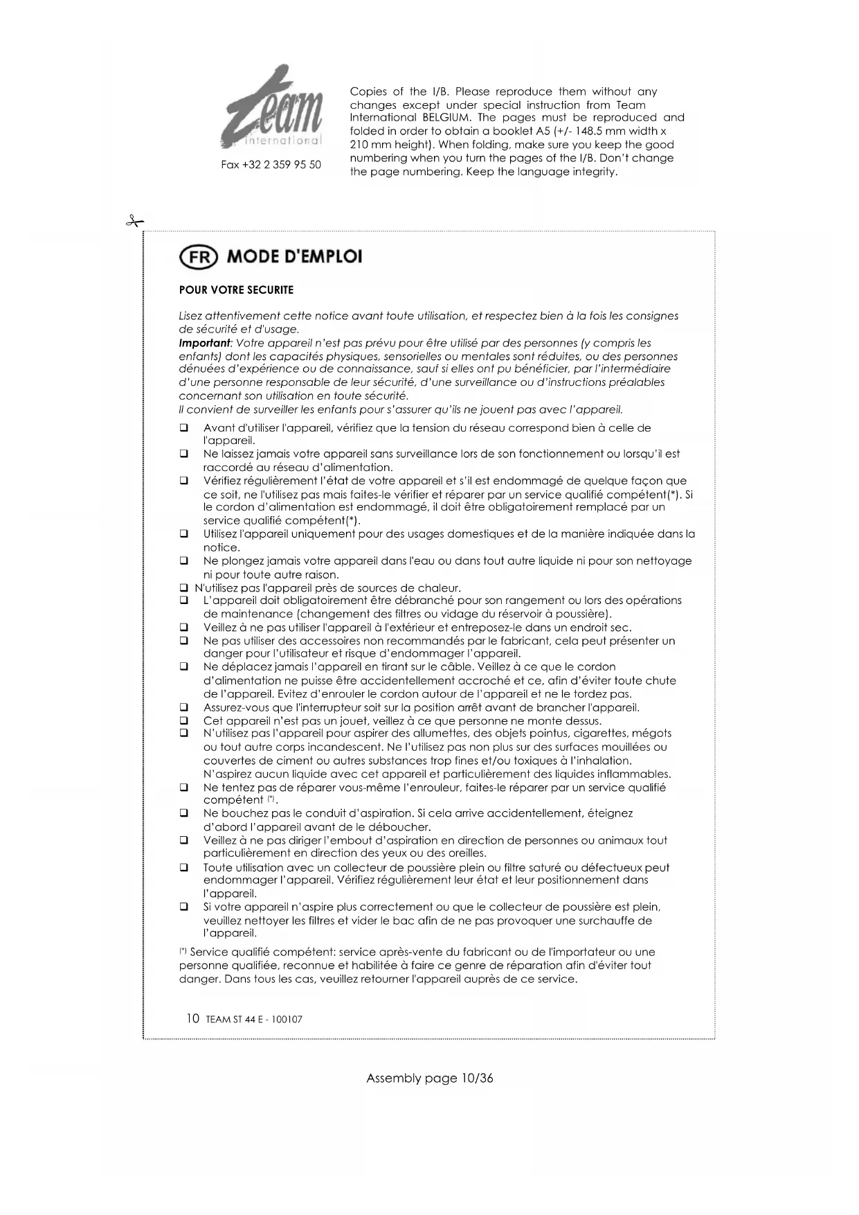 ST 44 - Aspirateur TEAM - Notice d'utilisation et mode d'emploi gratuit