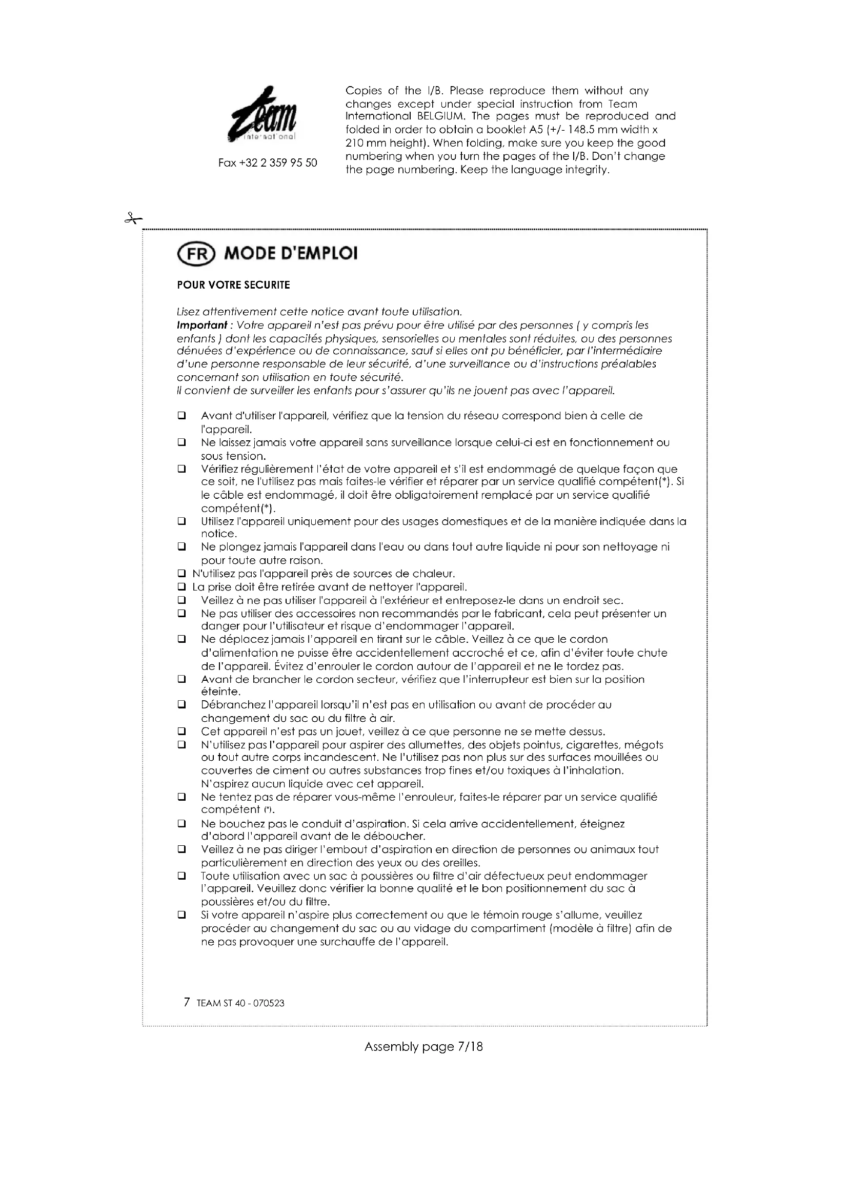 ST 40 - Aspirateur TEAM - Notice d'utilisation et mode d'emploi gratuit