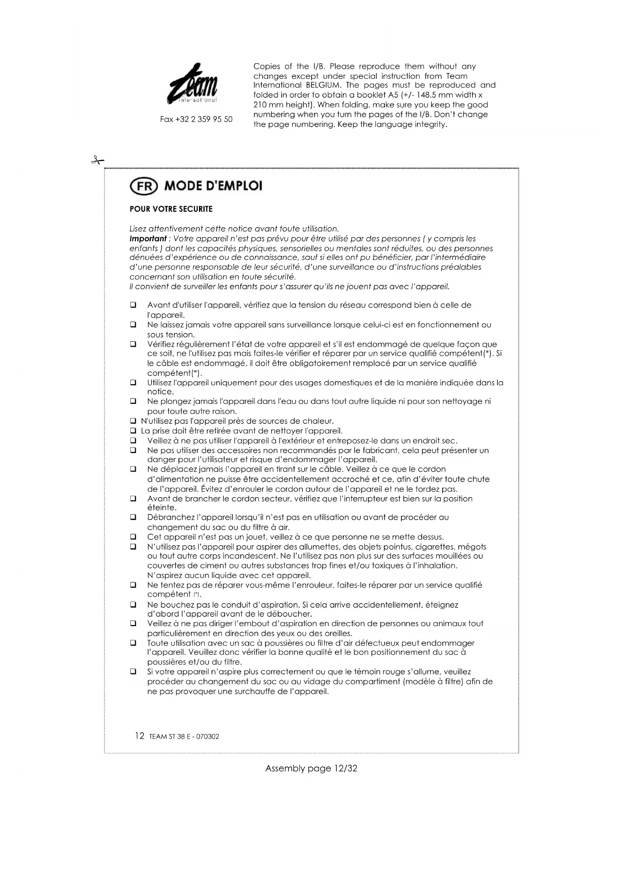 Ne bouchez pas le conduit d’aspiration. Si cela arrive accidentellement, éteignez d’abord l’appareil avant de le déboucher. Veillez à ne pas diriger l’embout d’aspiration en direction de personnes ou animaux tout particulièrement en direction des yeux ou des oreilles. Toute utilisation avec un sac à poussières ou filtre d’air défectueux peut endommager l’appareil. Veuillez donc vérifier la bonne qualité et le bon positionnement du sac à poussières et/ou du filtre. Si votre appareil n’aspire plus correctement ou que le témoin rouge s’allume, veuillez procéder au changement du sac ou au vidage du compartiment (modèle à filtre) afin de ne pas provoquer une surchauffe de l’appareil. Copies of the I/B. Please reproduce them without any changes except under special instruction from Team International BELGIUM. The pages must be reproduced and folded in order to obtain a booklet A5 (+/- 148.5 mm width x 210 mm height). When folding, make sure you keep the good numbering when you turn the pages of the I/B. Don’t change the page numbering. Keep the language integrity.