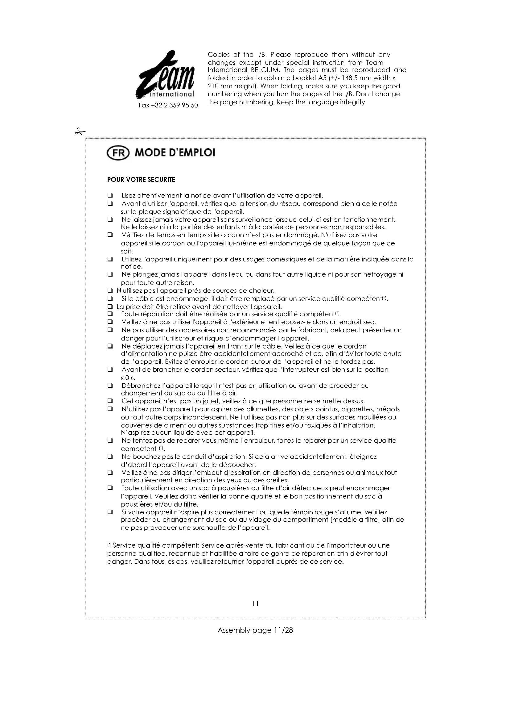 Fax +32 2 359 95 50 Débranchez l'appareil, retirez l‟embout du flexible du couvercle du bac poussières et remplacez le sac papier quand le témoin du remplissage du sac est complètement rouge. Ouvrez le couvercle du bac poussières. Sortez le sac de son support et jetez-le sans le plier. Remettez un sac papier dans son support. Refermez le capot et appuyez légèrement pour le bloquer. Connectez de nouveau l‟embout du flexible sur le couvercle du bac poussières. Si cette manipulation est difficile, vérifiez le positionnement de la cartonnette du sac papier sur son support. Filtre moteur Nettoyage du filtre anti-poussières (tous les 3 mois environ). Sortez le filtre de son logement et frottez-le pour le nettoyer. Vous pouvez aussi le nettoyer avec de l‟eau et du détergent mais rincez-le et laissez-le sécher complètement avant de le replacer dans son logement. Filtre à air Votre filtre vous garantit un air parfaitement propre lors de l'utilisation de votre aspirateur. Il reste efficace pendant environ 3 mois (cette période varie selon les utilisations et il est conseillé de le vérifier régulièrement). Votre appareil débranché, ouvrez la grille arrière contenant le filtre en pinçant sa languette et remplacez-le, refermez la grille. CONSEILS PRATIQUES Nettoyage des escaliers et marches: mettez votre appareil en position verticale. Pour un gain de place et pour faciliter son rangement, un logement est prévu sous votre appareil pour recevoir la tubulure de votre brosse universelle. Par conséquent, placez votre aspirateur verticalement et faites glisser la tubulure de votre brosse dans le logement prévu à cet effet. Ainsi, vous aurez votre flexible, les tubes et la brosse universelle accrochés à votre appareil en position verticale. Votre appareil ne demande pas d'entretien particulier excepté le changement des filtres et sacs papier comme ci-dessus. Dans le cas où vous remarqueriez un mauvais fonctionnement (diminution de puissance, bruit anormal, arrêt complet de l'appareil), vérifiez d'abord qu'il n'y a pas de blocage dans l'aspiration au niveau du tube ou du flexible et sinon apportez votre appareil pour vérification ou réparation dans un centre agréé. Copies of the I/B. Please reproduce them without any changes except under special instruction from Team International BELGIUM. The pages must be reproduced and folded in order to obtain a booklet A5 (+/- 148.5 mm width x 210 mm height). When folding, make sure you keep the good numbering when you turn the pages of the I/B. Don‟t change the page numbering. Keep the language integrity.