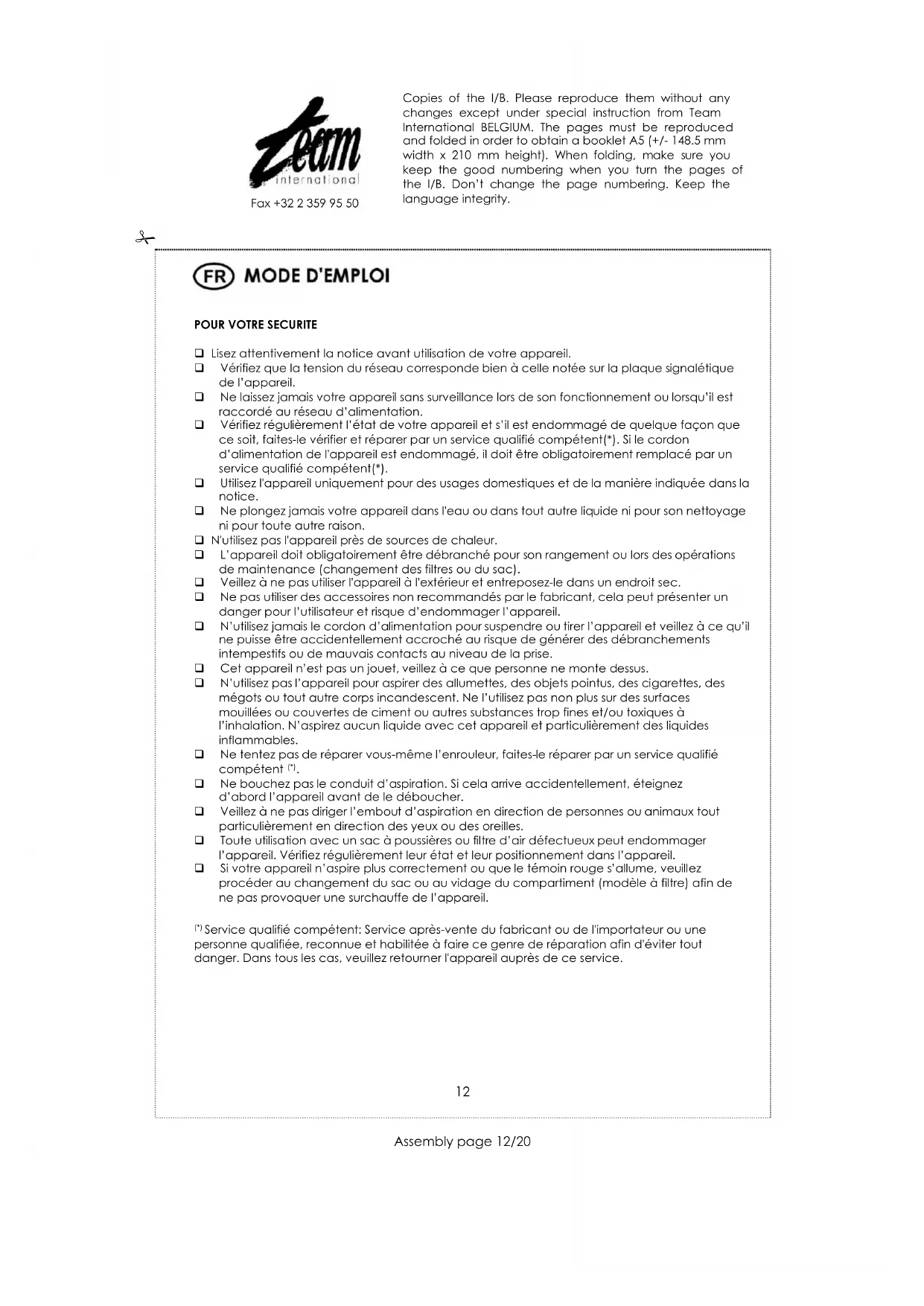 (*) Service qualifié compétent: Service après-vente du fabricant ou de l'importateur ou une personne qualifiée, reconnaue et habitée à faire ce genre de réparation afin d'éviter tout danger. Dans tous les cas, veuillez returner l'appareil auprès de ce service.