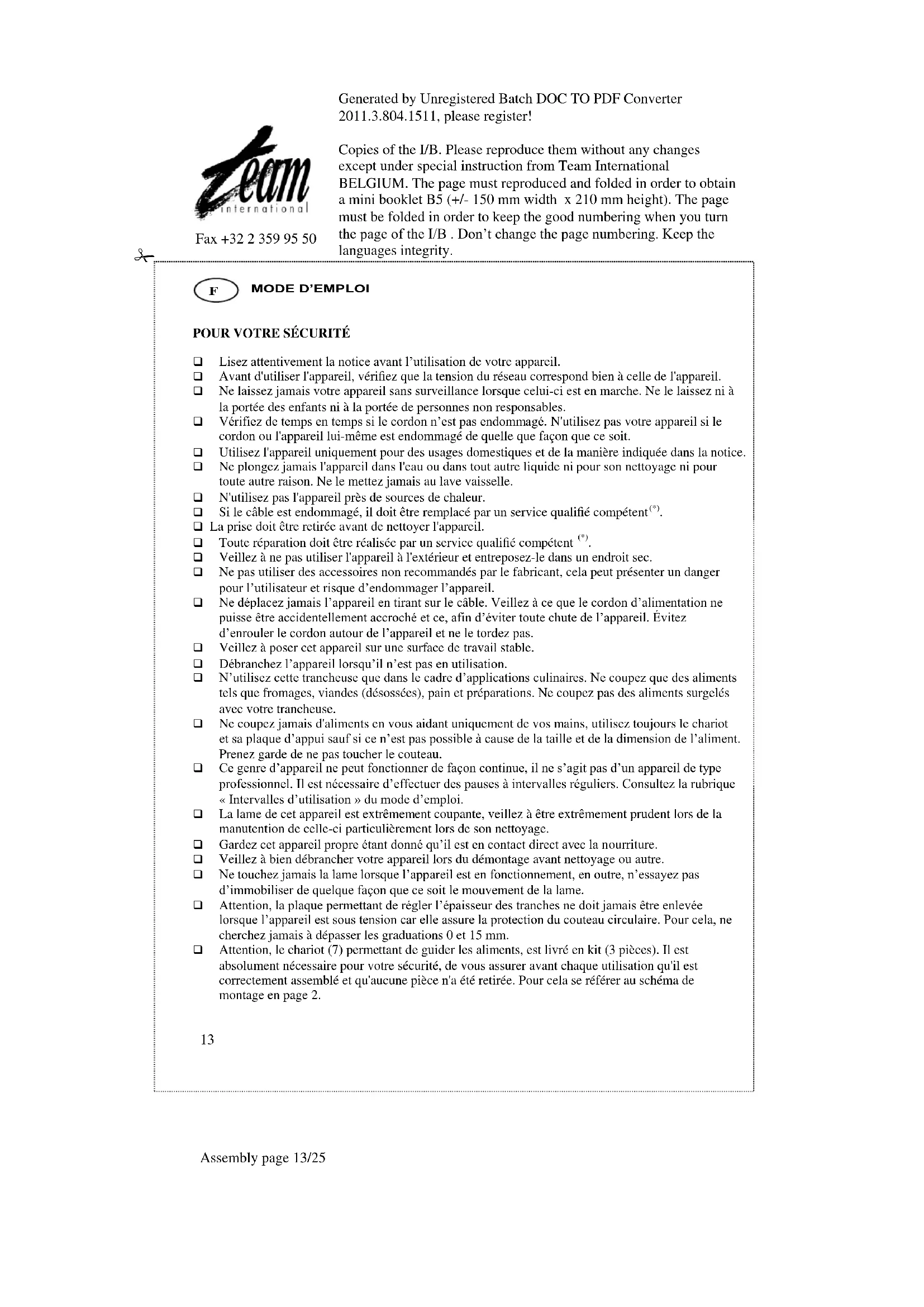 Veillez à ne pas utiliser l'appareil à l'extérieur et entreposez-le dans un endroit sec. Ne pas utiliser des accessoires non recommandés par le fabricant, cela peut présenter un danger pour l’utilisateur et risque d’endommager l’appareil. Ne déplacez jamais l’appareil en tirant sur le câble. Veillez à ce que le cordon d’alimentation ne puisse être accidentellement accroché et ce, afin d’éviter toute chute de l’appareil. Évitez d’enrouler le cordon autour de l’appareil et ne le tordez pas. Veillez à poser cet appareil sur une surface de travail stable. Débranchez l’appareil lorsqu’il n’est pas en utilisation. N’utilisez cette trancheuse que dans le cadre d’applications culinaires. Ne coupez que des aliments tels que fromages, viandes (désossées), pain et préparations. Ne coupez pas des aliments surgelés avec votre trancheuse. Ne coupez jamais d'aliments en vous aidant uniquement de vos mains, utilisez toujours le chariot et sa plaque d’appui sauf si ce n’est pas possible à cause de la taille et de la dimension de l’aliment. Prenez garde de ne pas toucher le couteau. Ce genre d’appareil ne peut fonctionner de façon continue, il ne s’agit pas d’un appareil de type professionnel. Il est nécessaire d’effectuer des pauses à intervalles réguliers. Consultez la rubrique « Intervalles d’utilisation » du mode d’emploi. La lame de cet appareil est extrêmement coupante, veillez à être extrêmement prudent lors de la manutention de celle-ci particulièrement lors de son nettoyage. Gardez cet appareil propre étant donné qu’il est en contact direct avec la nourriture. Veillez à bien débrancher votre appareil lors du démontage avant nettoyage ou autre. Ne touchez jamais la lame lorsque l’appareil est en fonctionnement, en outre, n’essayez pas d’immobiliser de quelque façon que ce soit le mouvement de la lame. Attention, la plaque permettant de régler l’épaisseur des tranches ne doit jamais être enlevée lorsque l’appareil est sous tension car elle assure la protection du couteau circulaire. Pour cela, ne cherchez jamais à dépasser les graduations 0 et 15 mm. Attention, le chariot (7) permettant de guider les aliments, est livré en kit (3 pièces). Il est absolument nécessaire pour votre sécurité, de vous assurer avant chaque utilisation qu'il est correctement assemblé et qu'aucune pièce n'a été retirée. Pour cela se référer au schéma de montage en page 2.Generated by Unregistered Batch DOC TO PDF Converter 2011.3.804.1511, please register! Copies of the I/B. Please reproduce them without any changes except under special instruction from Team International BELGIUM. The page must reproduced and folded in order to obtain a mini booklet B5 (+/- 150 mm width x 210 mm height). The page must be folded in order to keep the good numbering when you turn the page of the I/B . Don’t change the page numbering. Keep the languages integrity.