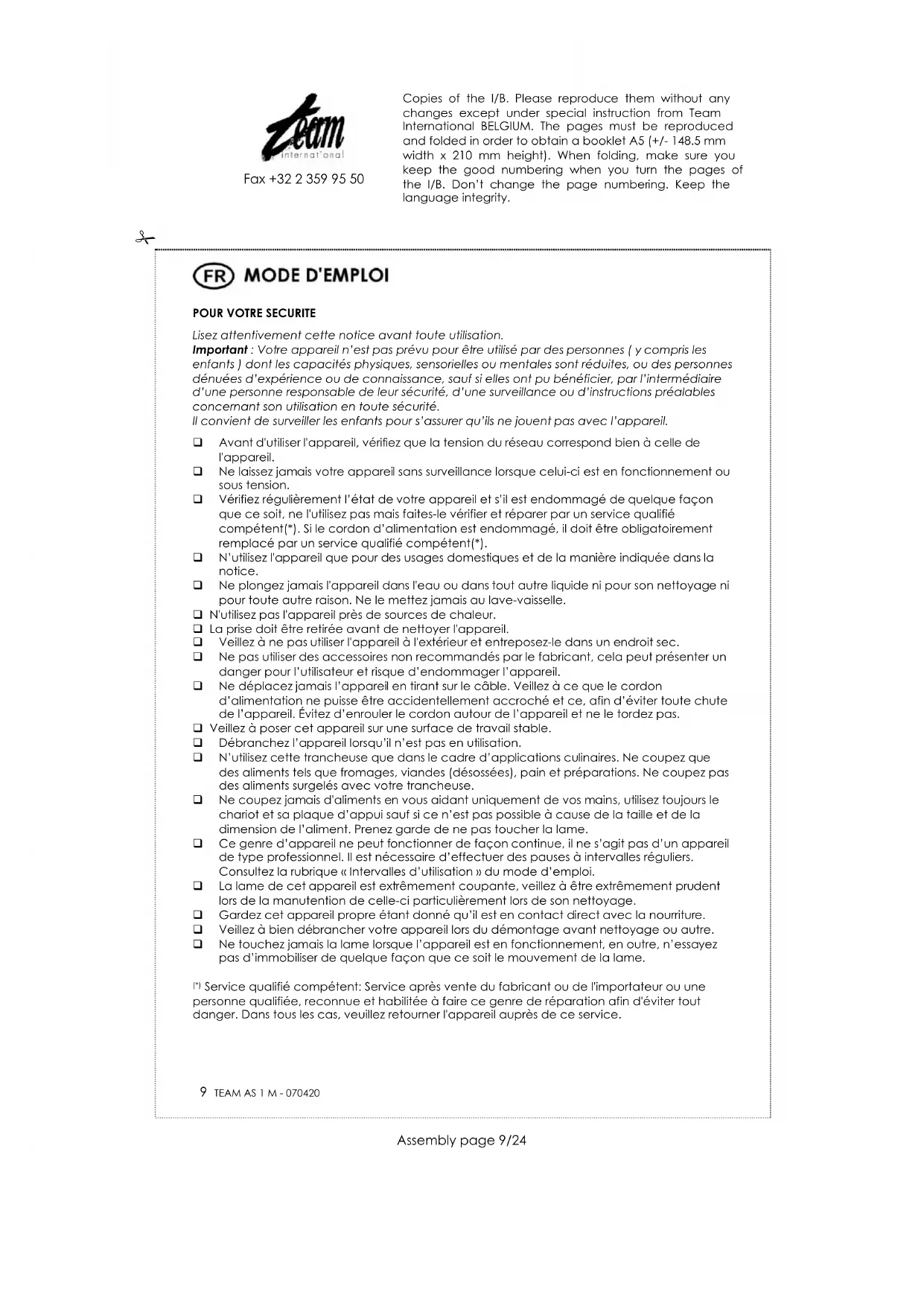 Pour un usage en toute sécurité, votre appareil est livré avec un dispositif complet ( chariot (4) équipé d’une protection du pouce (6) et guide (3) ) qui permet de protéger vos mains tout en vous procurant un confort d’usage exceptionnel. Le chariot vous permet de réaliser le mouvement de va et vient le long de la lame pour couper les tranches. Faites usage de sa poignée lors du déplacement. Le guide vous permet de maintenir les aliments lors de leur découpe en tenant votre main loin du couteau. Pour cette raison, il vous est fortement conseillé de toujours l’utiliser sauf si l’aliment est trop grand et dans ce cas maintenez-le fermement le plus loin possible du couteau. Lavez toutes les pièces de votre appareil avant de l'utiliser pour la première fois. Posez votre appareil sur une surface plane et stable, puis ajoutez le guide (3) sur le chariot (4). Branchez l'appareil. Votre trancheuse est à présent prête à l’emploi. Placez une assiette ou un plat derrière la lame pour récupérer les tranches. Dégagez le chariot du couteau et posez les aliments à trancher sur son plateau en inox. Poussez les aliments contre la face mobile de l’appareil à l’aide du guide (3) et réglez l'épaisseur de coupe désirée à l'aide de la manette (5). Placez l’interrupteur (2) en position 1. La lame commencera à tourner et le voyant de l’interrupteur s’allumera. Guidez les aliments vers la lame en vous aidant du chariot. Pour cela, utilisez la poignée du chariot et maintenez la pression exercée sur la face mobile de l’appareil par le guide. Si, à certains moments, vous éprouvez de la difficulté à trancher les aliments ( freinage important du couteau ), reculez légèrement et recommencez l’opération en avançant doucement vers la lame. Humidifiez ou huilez légèrement la lame circulaire avant de couper les aliments. Cela évitera qu’ils ne collent à la lame et améliorera la découpe. N'utilisez pas votre trancheuse pour couper la viande avec os, les aliments comprenant de gros noyaux, le rôti en filet, les emballages (par ex. papier aluminium), les aliments surgelés et les parties dures et non comestibles des aliments. NETTOYAGE L’interrupteur doit être placé en position «0» (arrêt) et la fiche du cordon d’alimentation doit obligatoirement être débranchée avant de nettoyer l’appareil. Nettoyez l’appareil à l’aide de papier absorbant ou d’un chiffon doux. Ne mettez jamais votre appareil dans le lave-vaisselle ( le chariot se bascule pour vous faciliter le nettoyage). Ne nettoyez jamais votre appareil (extérieur et intérieur) à l’aide de produits ou tampons abrasifs car cela abîmerait le revêtement. N'immergez pas l'appareil dans l'eau ou tout autre liquide. Essuyez bien toutes les pièces avant de ranger l'appareil. Copies of the I/B. Please reproduce them without any changes except under special instruction from Team International BELGIUM. The pages must be reproduced and folded in order to obtain a booklet A5 (+/- 148.5 mm width x 210 mm height). When folding, make sure you keep the good numbering when you turn the pages of the I/B. Don’t change the page numbering. Keep the language integrity.