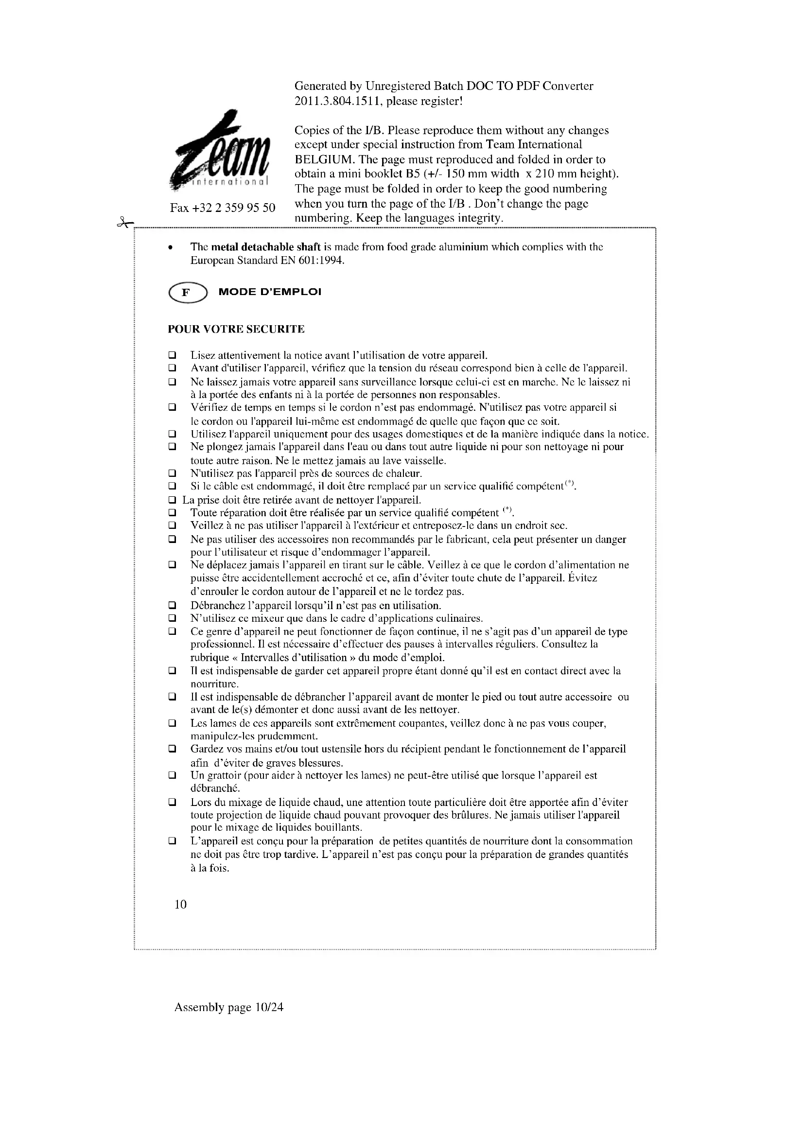 Cet appareil ne peut être utilisé de façon professionnelle. Vous devez respecter les pauses de fonctionnement. Dans le cas contraire vous risqueriez d’endommager le moteur. Référez-vous à la plaque signalétique de votre appareil pour connaître la durée maximale d’utilisation continue (notée KB xx min. où xx est la durée maximale). Les pauses de fonctionnement doivent durer au moins 10 minutes. COMMENT L’UTILISER ? Facile, pratique et simple à nettoyer. Ce mixeur convient parfaitement pour milk-shakes, soupes, œufs et bien d’autres encore ! Avant la première utilisation, l'appareil doit être nettoyé avec une lavette légèrement humide. Vissez le pied sur le pas de vis situé au bas du moteur. Veillez à visser le pied dans le sens indiqué par le symbole de fermeture . C'est une vis filetée à gauche. Seule une légère pression de la main garantira que le pied soit bien fixé au moteur. Versez les ingrédients dans le gobelet ou dans un autre récipient en dosant de façon à ne pas dépasser un niveau tel que vous risqueriez d’être éclaboussé ! Branchez le cordon secteur dans une prise. Plongez le pied de l'appareil au sein des ingrédients avant de mettre en marche celui-ci. Cela évitera les éclaboussures lorsque le moteur sera allumé. Allumez le moteur et mixez mais souvenez-vous de ne pas utiliser l'appareil pour plus de 3 minutes en continu. Le moteur doit ensuite être mis en pause pendant 10 minutes. NETTOYAGE DU PIED DÉTACHABLE EN MÉTAL Toujours débrancher l’appareil avant de procéder au nettoyage de celui-ci. Le bloc moteur ne doit être nettoyé qu’avec une lavette légèrement humide. Dévissez le pied détachable en métal du pas de vis situé au bas du moteur. Veillez à dévisser le pied dans le sens indiqué par le symbole d'ouverture . NE METTEZ PAS le pied détachable en métal au LAVE-VAISSELLE. Les produits chimiques utilisés dans les lave-vaisselle marqueraient et tacheraient la surface du pied en aluminium. Séchez le pied vigoureusement. Pour de meilleurs résultats après nettoyage et séchage, enduire légèrement les surfaces en métal avec de l'huile d'olive. Cela maintiendra le revêtement brillant et sans tâches. NE PAS PLONGER LE BLOC MOTEUR DANS DE L’EAU OU TOUT AUTRE LIQUIDE. Le pied détachable en métal est fabriqué en aluminium conforme au Standard Européen EN 601:1994, et convient donc à l'usage de nourriture.Generated by Unregistered Batch DOC TO PDF Converter 2011.3.804.1511, please register! Copies of the I/B. Please reproduce them without any changes except under special instruction from Team International BELGIUM. The page must reproduced and folded in order to obtain a mini booklet B5 (+/- 150 mm width x 210 mm height). The page must be folded in order to keep the good numbering when you turn the page of the I/B . Don’t change the page numbering. Keep the languages integrity.