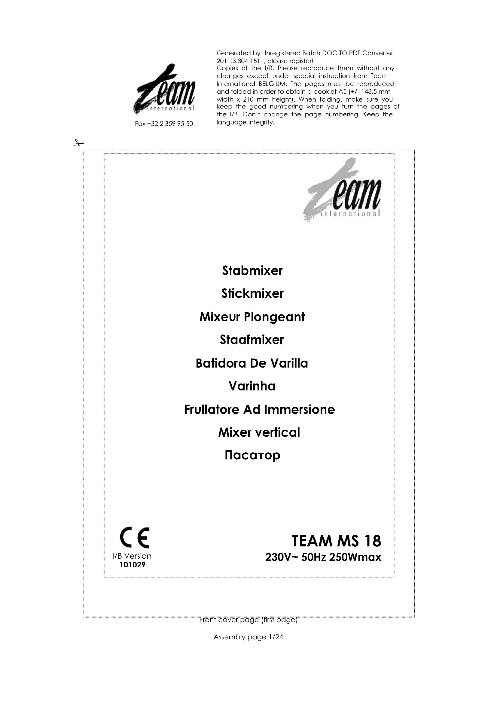 Utilisez l'appareil uniquement pour des usages domestiques et de la manière indiquée dans la notice. Ne plongez jamais l'appareil dans l'eau ou dans tout autre liquide ni pour son nettoyage ni pour toute autre raison. Ne le mettez jamais au lave-vaisselle. N'utilisez pas l'appareil près de sources de chaleur. Débranchez toujours l’appareil lorsqu’il n’est pas en utilisation et plus spécifiquement lorsque vous le laissez sans surveillance ou lorsque vous effectuez les opérations de montage, démontage et nettoyage ou que vous videz le récipient. Veillez à ne pas utiliser l'appareil à l'extérieur et entreposez-le dans un endroit sec. Ne pas utiliser des accessoires non recommandés par le fabricant, cela peut présenter un danger pour l’utilisateur et risque d’endommager l’appareil. Ne déplacez jamais l’appareil en tirant sur son cordon d’alimentation. Veillez à ce qu’il ne puisse être accidentellement accroché et ce, afin d’éviter toute chute de l’appareil. Utilisez cet appareil uniquement dans le cadre d’applications culinaires. Ce genre d’appareil ne peut pas fonctionner de façon continue, il ne s’agit pas d’un appareil de type professionnel. Il est nécessaire d’effectuer des pauses à intervalles réguliers. Consultez la rubrique « Intervalles d’utilisation » du mode d’emploi. Il est indispensable de garder cet appareil propre étant donné qu’il est en contact direct avec la nourriture. Consultez la rubrique « nettoyage » du mode d’emploi. Attention, la lame du pied mixer est très coupante, alors prenez garde de ne pas vous couper lors de sa manipulation. Assurez-vous que l’accessoire utilisé soit fermement et correctement verrouillé au bloc moteur avant de mettre l’appareil en fonctionnement. Gardez vos mains et/ou tout ustensile hors du récipient pendant le fonctionnement de l’appareil afin d’éviter de graves blessures. Lors du mixage de liquide chaud, une attention toute particulière doit être apportée afin d’éviter toute projection de liquide chaud pouvant provoquer des brûlures. Ne jamais utiliser l'appareil pour le mixage de liquides bouillants. L’appareil est conçu pour la préparation de petites quantités de nourriture dont la consommation ne doit pas être trop tardive. L’appareil n’est pas conçu pour la préparation de grandes quantités à la fois. Ne touchez jamais la lame lorsque l’appareil est en fonctionnement, en outre, n’essayez pas d’immobiliser de quelque façon que ce soit le mouvement de la lame. Copies of the I/B. Please reproduce them without any changes except under special instruction from Team International BELGIUM. The pages must be reproduced and folded in order to obtain a booklet A5 (+/- 148.5 mm width x 210 mm height). When folding, make sure you keep the good numbering when you turn the pages of the I/B. Don’t change the page numbering. Keep the language integrity.