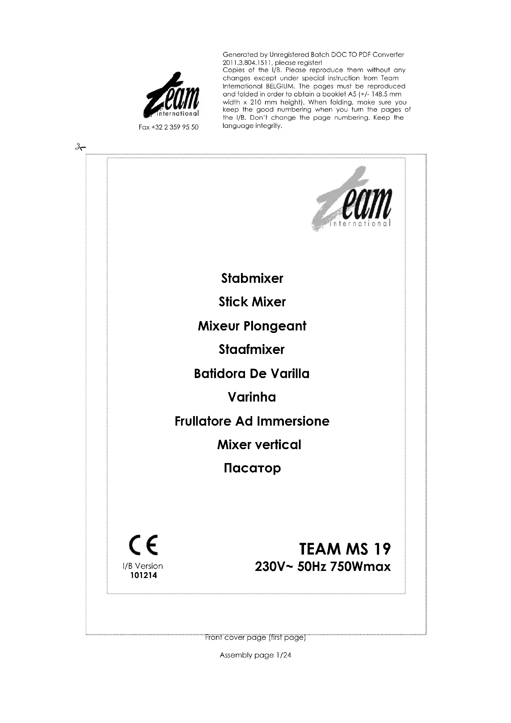 Afin de préserver notre environnement et notre santé, l’élimination en fin de vie des appareils électriques et électroniques doit se faire selon des règles bien précises et nécessite l’implication de chacun, qu’il soit fournisseur ou utilisateur. C’est pour cette raison que votre appareil, tel que le signale le symbole apposé sur sa plaque signalétique ou sur l'emballage, ne doit en aucun cas être jeté dans une poubelle publique ou privée destinée aux ordures ménagères. L'utilisateur a le droit de déposer l'appareil dans des lieux publics de collecte procédant à un tri sélectif des déchets pour être soit recyclé, soit réutilisé pour d’autres applications conformément à la directive. Copies of the I/B. Please reproduce them without any changes except under special instruction from Team International BELGIUM. The pages must be reproduced and folded in order to obtain a booklet A5 (+/- 148.5 mm width x 210 mm height). When folding, make sure you keep the good numbering when you turn the pages of the I/B. Don’t change the page numbering. Keep the language integrity.