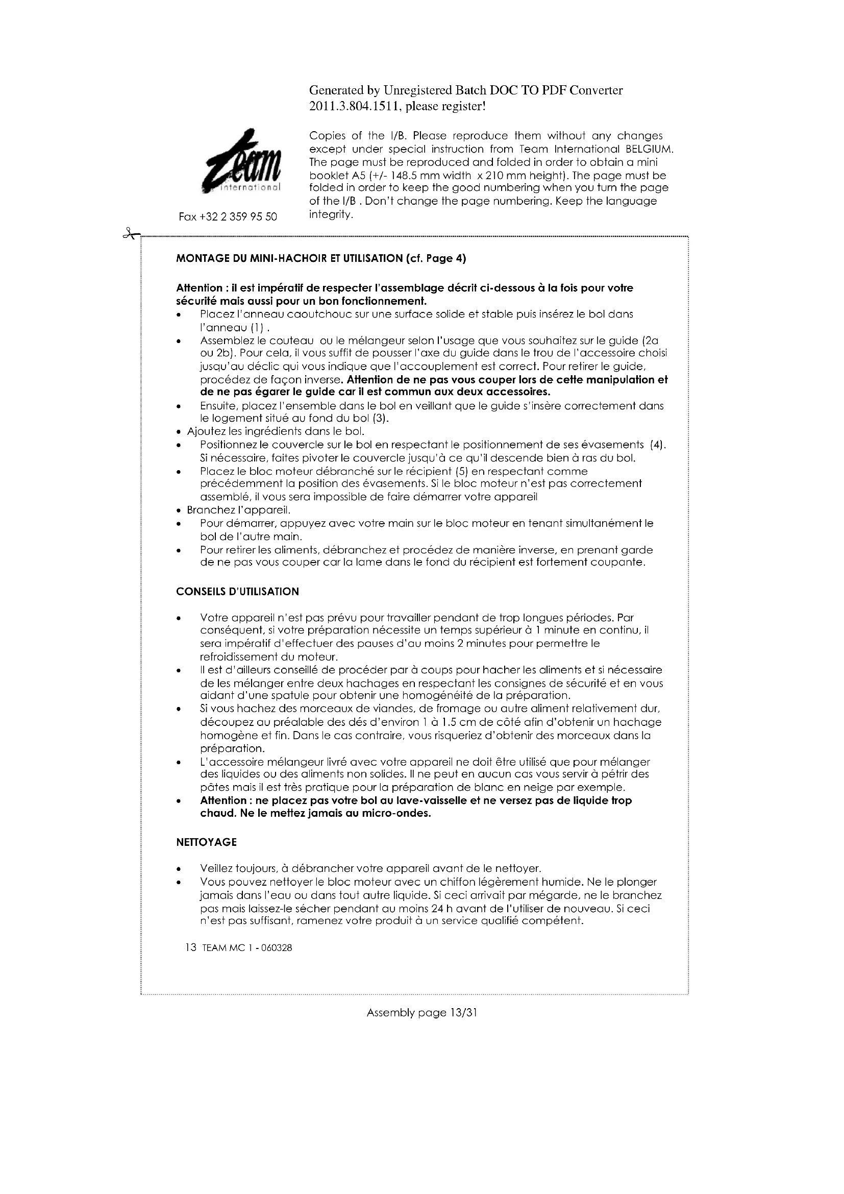 Votre appareil n’est pas prévu pour travailler pendant de trop longues périodes. Par conséquent, si votre préparation nécessite un temps supérieur à 1 minute en continu, il sera impératif d’effectuer des pauses d’au moins 2 minutes pour permettre le refroidissement du moteur. Il est d’ailleurs conseillé de procéder par à coups pour hacher les aliments et si nécessaire de les mélanger entre deux hachages en respectant les consignes de sécurité et en vous aidant d’une spatule pour obtenir une homogénéité de la préparation. Si vous hachez des morceaux de viandes, de fromage ou autre aliment relativement dur, découpez au préalable des dés d’environ 1 à 1.5 cm de côté afin d’obtenir un hachage homogène et fin. Dans le cas contraire, vous risqueriez d’obtenir des morceaux dans la préparation. L’accessoire mélangeur livré avec votre appareil ne doit être utilisé que pour mélanger des liquides ou des aliments non solides. Il ne peut en aucun cas vous servir à pétrir des pâtes mais il est très pratique pour la préparation de blanc en neige par exemple. Attention : ne placez pas votre bol au lave-vaisselle et ne versez pas de liquide trop chaud. Ne le mettez jamais au micro-ondes. NETTOYAGE Veillez toujours, à débrancher votre appareil avant de le nettoyer. Vous pouvez nettoyer le bloc moteur avec un chiffon légèrement humide. Ne le plonger jamais dans l’eau ou dans tout autre liquide. Si ceci arrivait par mégarde, ne le branchez pas mais laissez-le sécher pendant au moins 24 h avant de l’utiliser de nouveau. Si ceci n’est pas suffisant, ramenez votre produit à un service qualifié compétent.Generated by Unregistered Batch DOC TO PDF Converter 2011.3.804.1511, please register! Copies of the I/B. Please reproduce them without any changes except under special instruction from Team International BELGIUM. The page must be reproduced and folded in order to obtain a mini booklet A5 (+/- 148.5 mm width x 210 mm height). The page must be folded in order to keep the good numbering when you turn the page of the I/B . Don’t change the page numbering. Keep the language integrity.