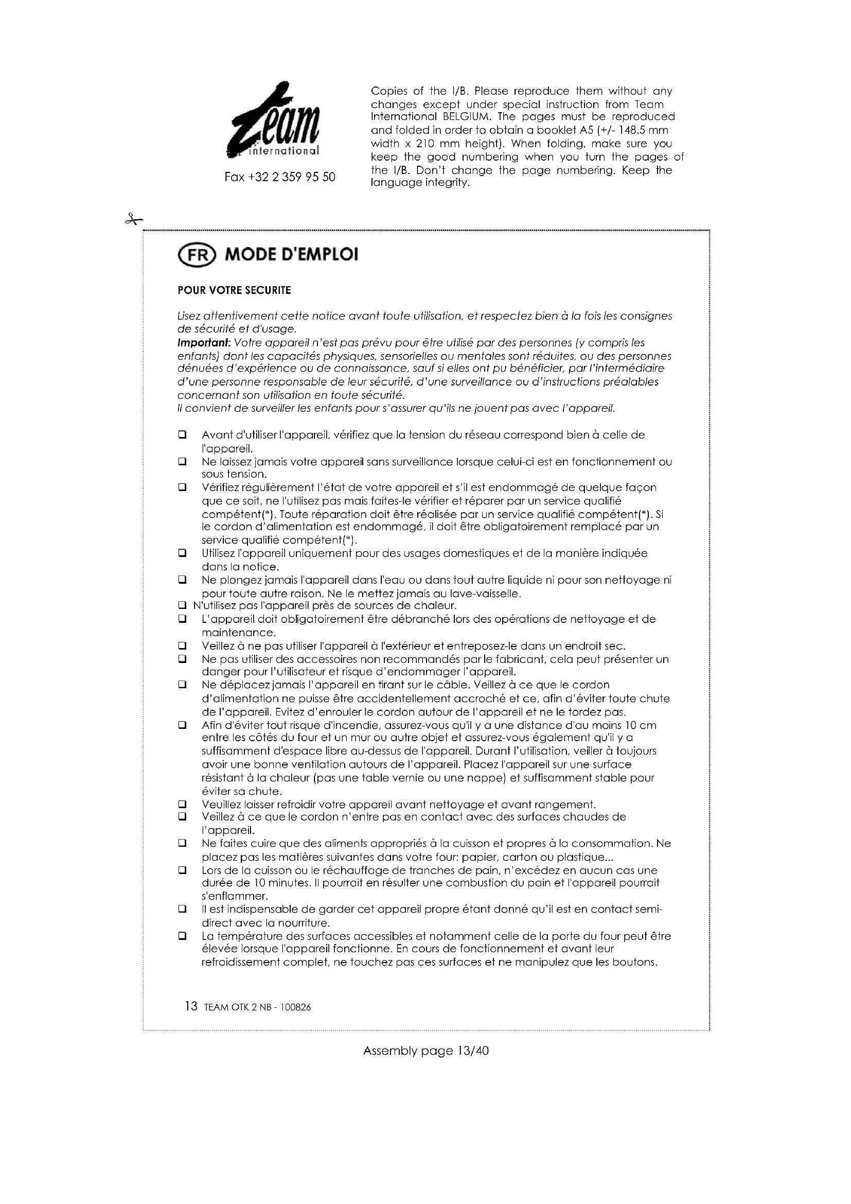 Afin de préserver notre environnement et notre santé, l’élimination en fin de vie des appareils électriques et électroniques doit se faire selon des règles bien précises et nécessite l’implication de chacun, qu’il soit fournisseur ou utilisateur. C’est pour cette raison que votre appareil, tel que le signale le symbole apposé sur sa plaque signalétique ou sur l'emballage, ne doit en aucun cas être jeté dans une poubelle publique ou privée destinée aux ordures ménagères. L'utilisateur a le droit de déposer l'appareil dans des lieux publics de collecte procédant à un tri sélectif des déchets pour être soit recyclé, soit réutilisé pour d’autres applications conformément à la directive. Copies of the I/B. Please reproduce them without any changes except under special instruction from Team International BELGIUM. The pages must be reproduced and folded in order to obtain a booklet A5 (+/- 148.5 mm width x 210 mm height). When folding, make sure you keep the good numbering when you turn the pages of the I/B. Don’t change the page numbering. Keep the language integrity.