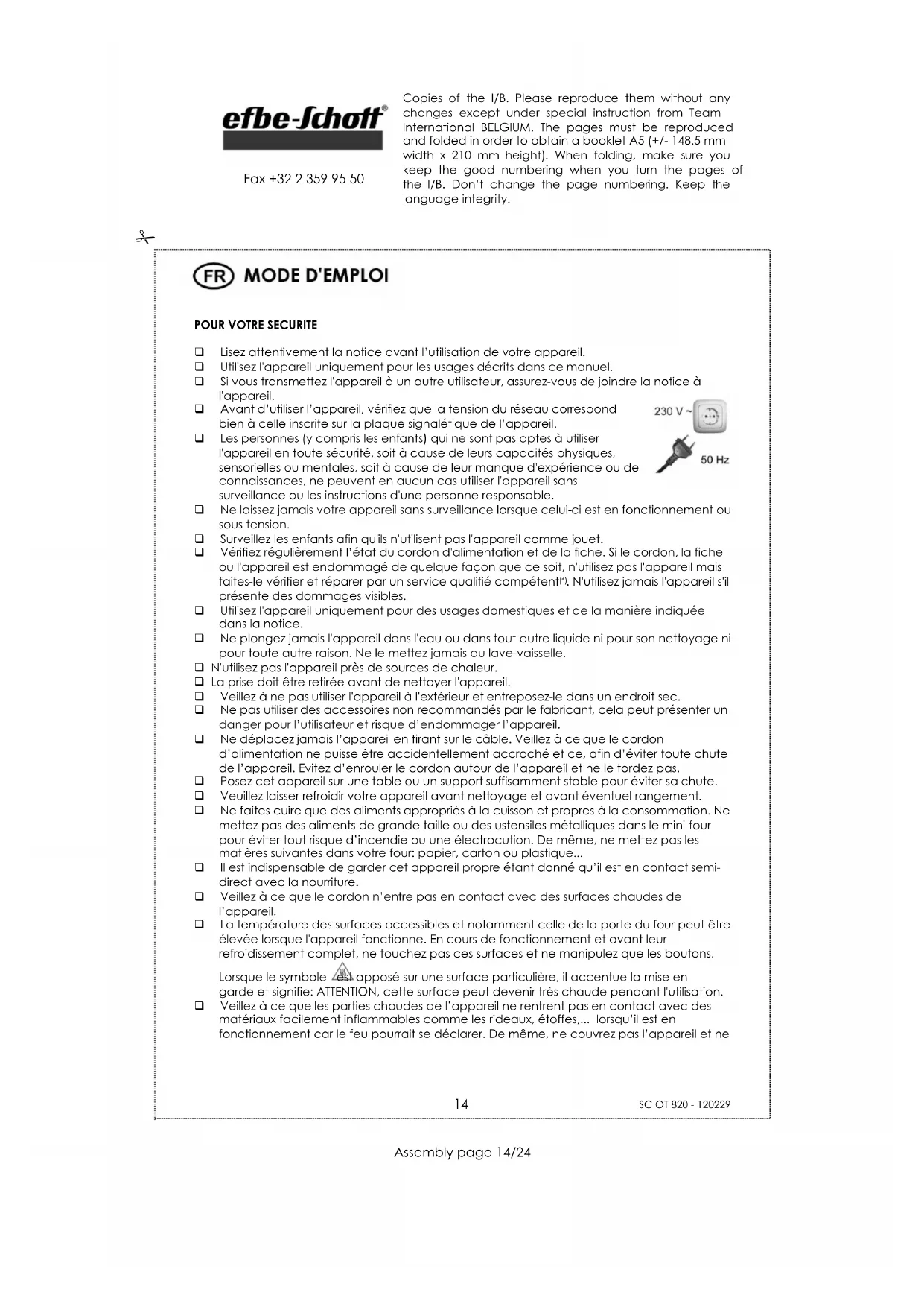 Fax +32 2 359 95 50 posez rien dessus. Prenez également garde que rien ne doit rentrer en contact avec l’élément chauffant de l’appareil. Il est conseillé de placer un revêtement thermifuge entre l’appareil et le support dans le but également de ne pas laisser des marques, provoquées par la chaleur, sur le revêtement de votre support. Les préparations à l'huile ou à la graisse peuvent s'enflammer si elles sont surchauffées. Soyez donc extrêmement prudent. Lors de la cuisson ou le réchauffage de tranches de pain, n’excédez en aucun cas une durée de 10 minutes. Il pourrait en résulter une combustion du pain. Cette remarque est d'autant plus importante que la minuterie permet une durée de 60 minutes; cette durée maximum est destinée à d'autres usages que le réchauffage du pain. Attention: Pour assurer l’aération correcte de l’appareil, assurez-vous qu’il y ait un intervalle d’au moins 10 cm des deux côtés et d’au moins 25cm au-dessus de la surface supérieure. Ne couvrez jamais les ouïes d’aération. Votre appareil ne doit jamais être mis en fonctionnement par le biais d’une minuterie extérieure ou d’un autre système de commande à distance séparé.